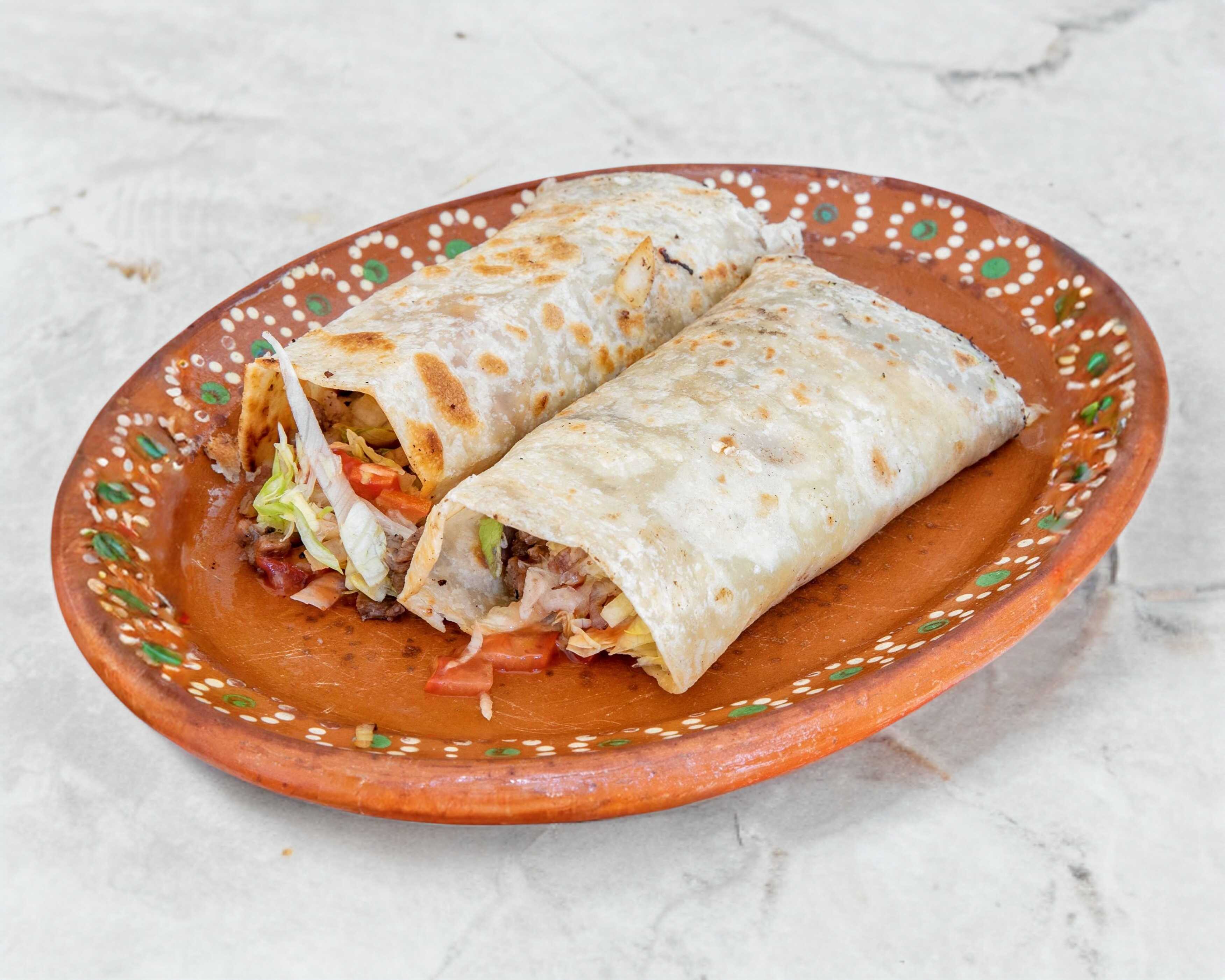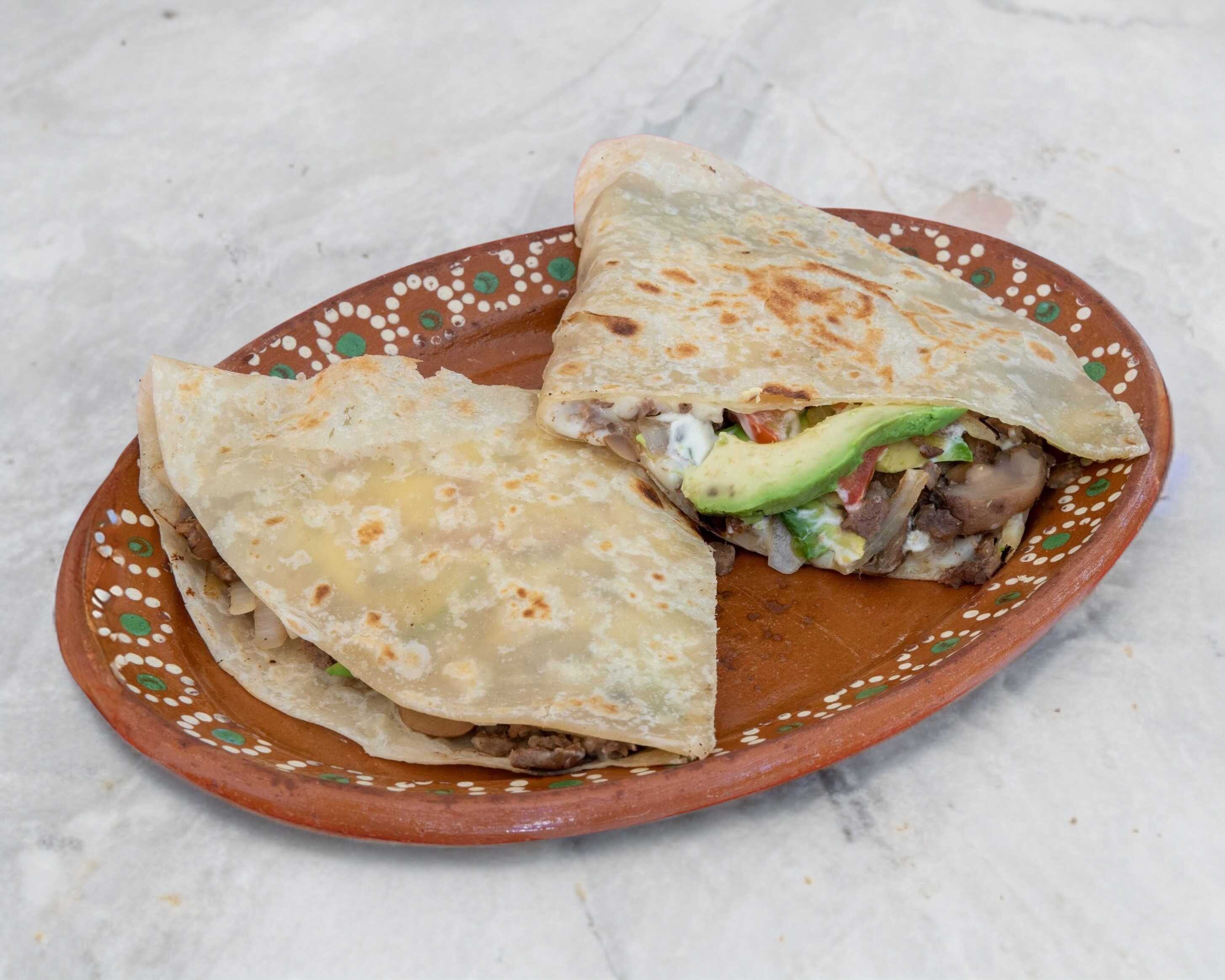 Tortilla de Harina con queso de quesadilla, carne asada, cebolla, champiñones,aguacate, jitomate y mayonesa