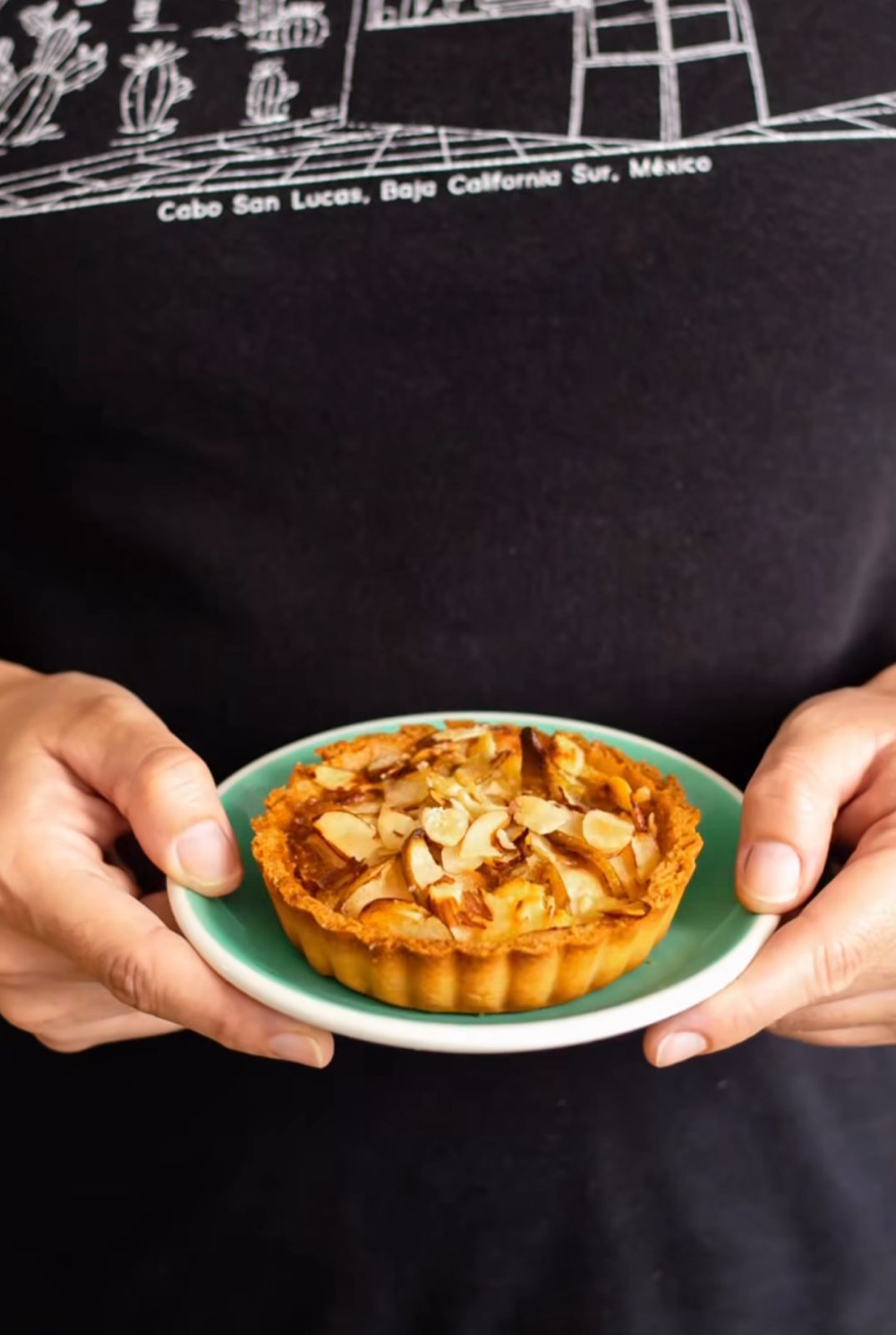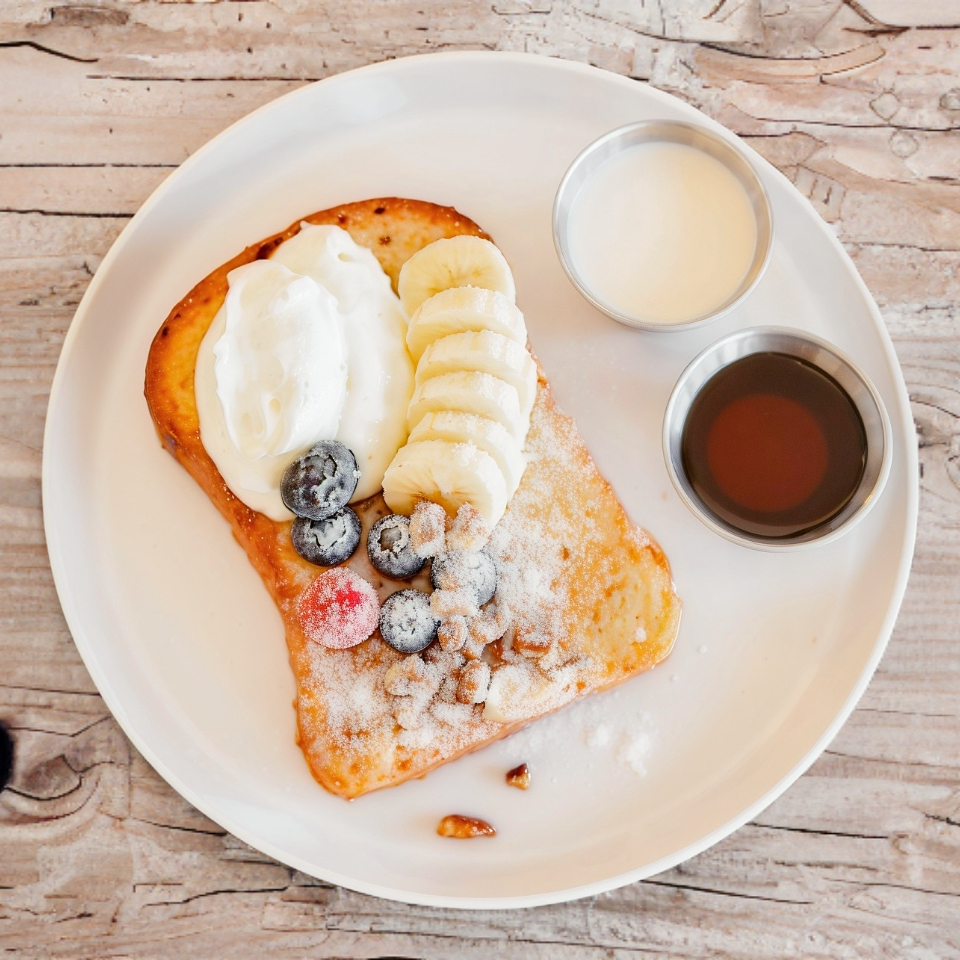 Pan francés con crema montada cítrica, fruta fresca, jarabe de tres leches y miel