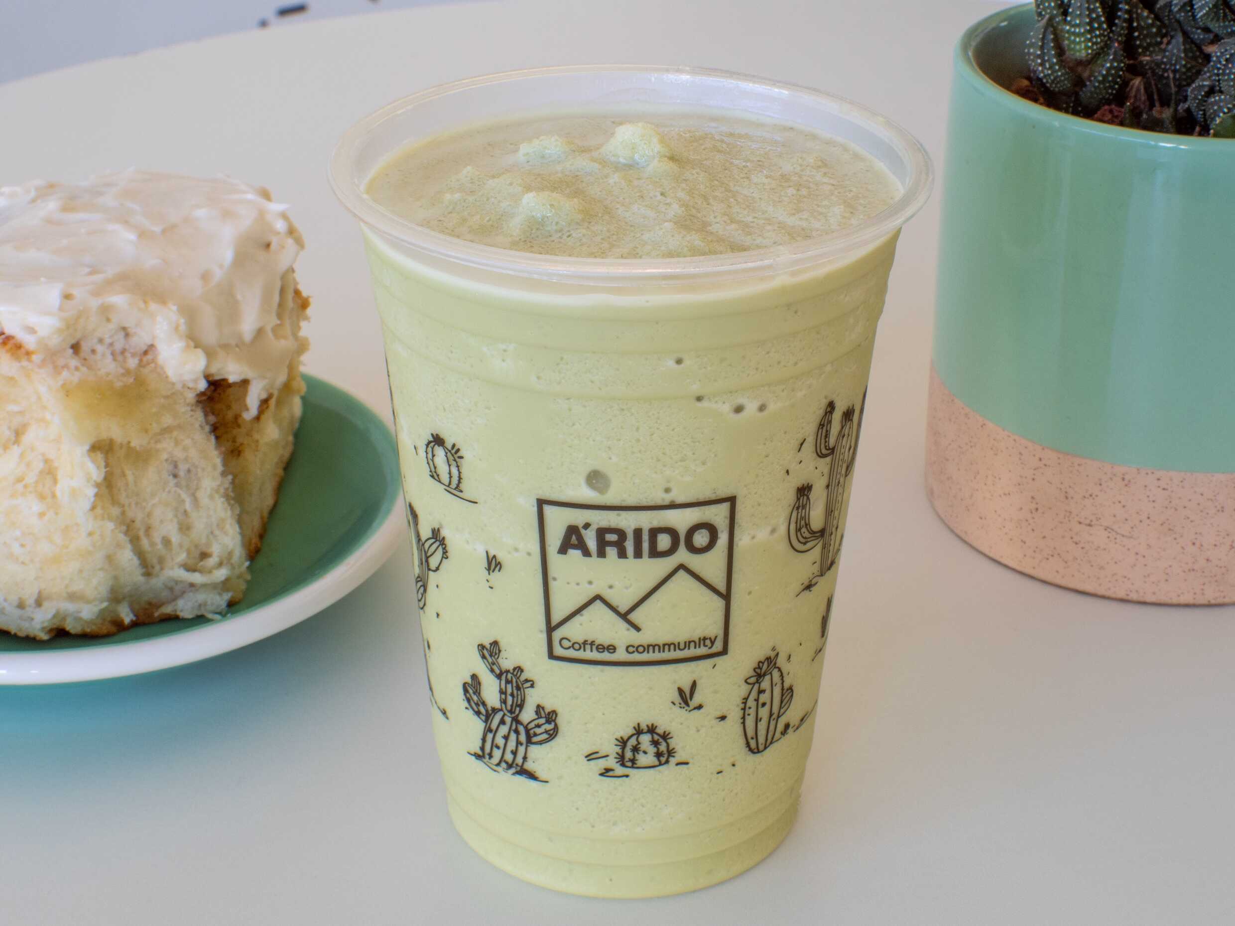 Té verde pulverizado y endulzado mezclado con leche emulsionada cremosa (12 oz).