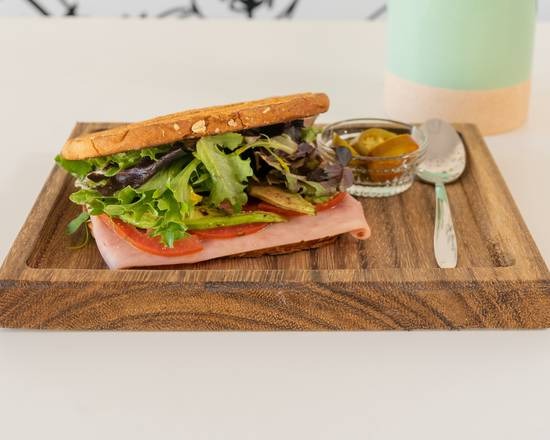 Pan integral, queso suizo, lechuga, tomate, aguacate, mayonesa y mostaza.
