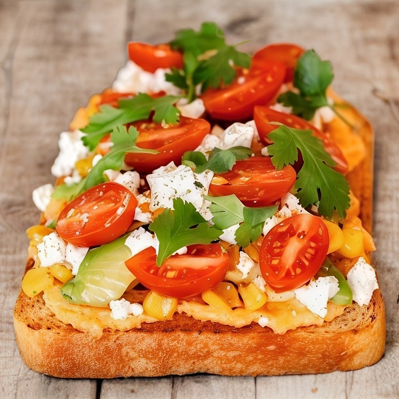 Puré de camote con ajo, aguacate, elote salteado, requesón, tomate cherry y aceite de chiles