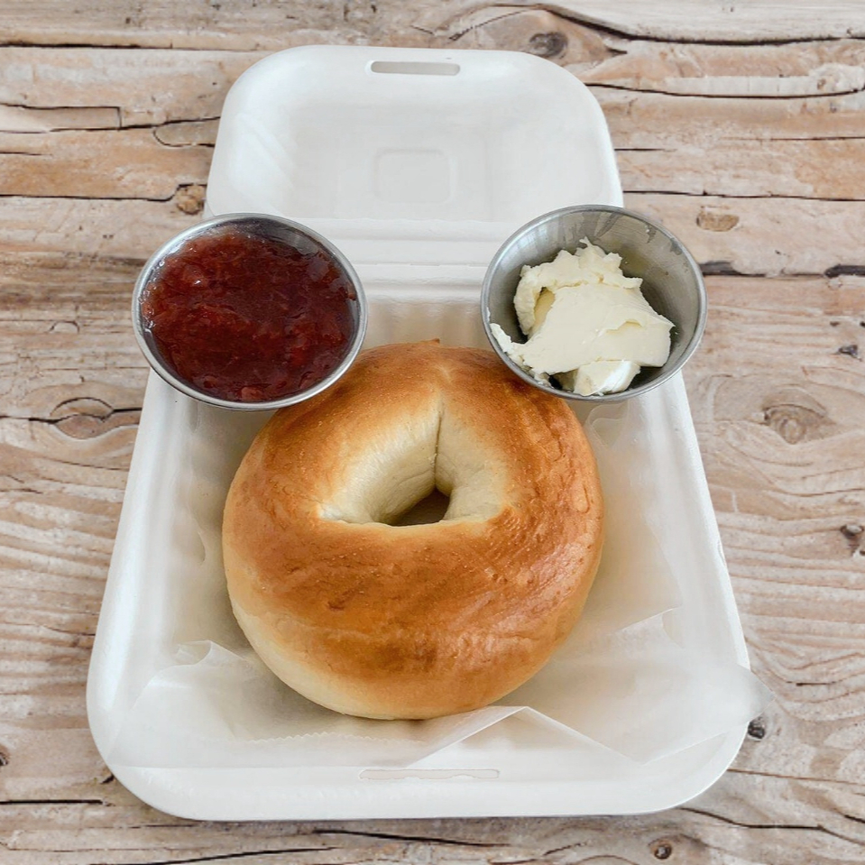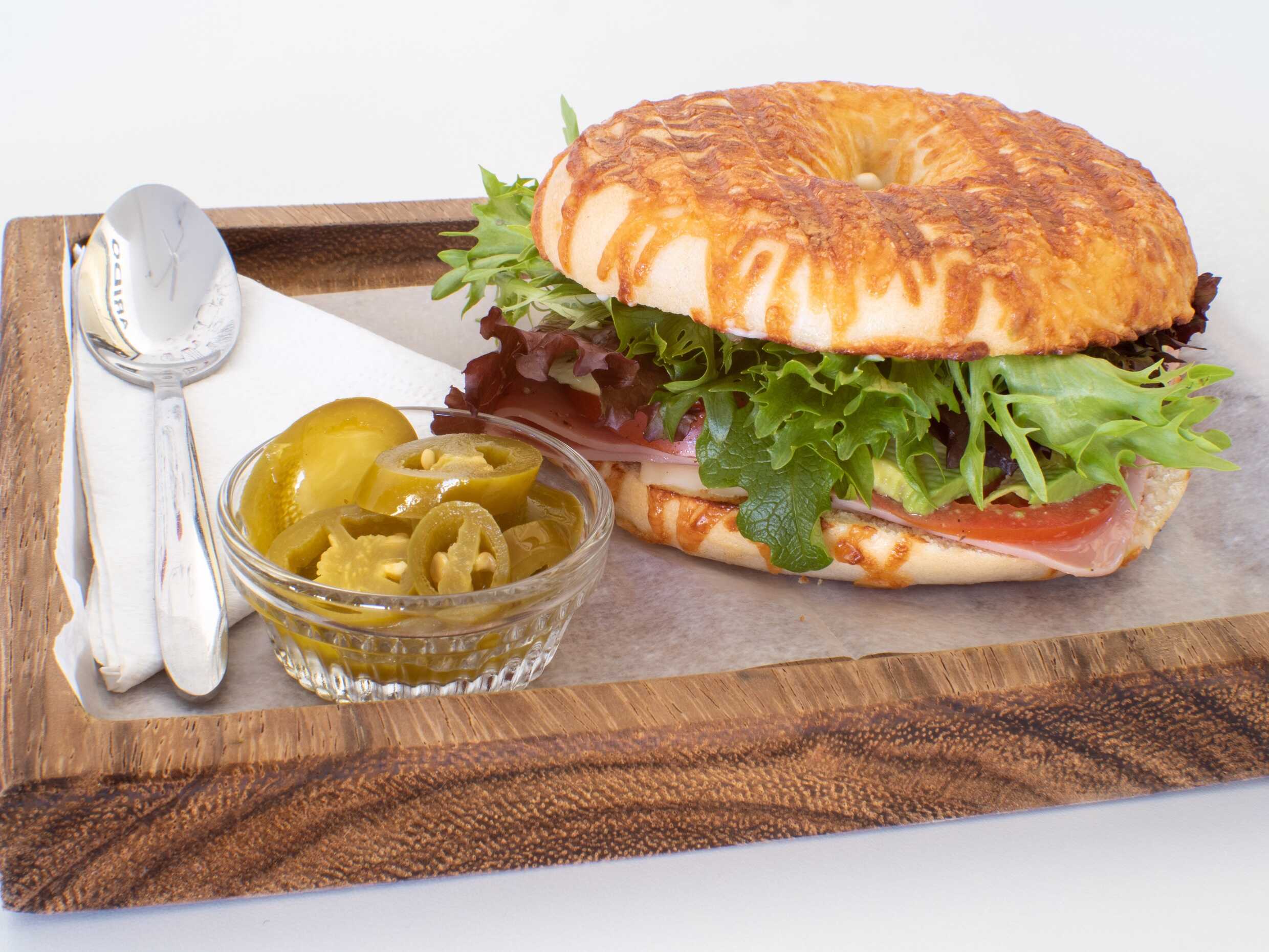 Pan de bagel, queso suizo, lechuga, tomate, aguacate, mayonesa y mostaza.