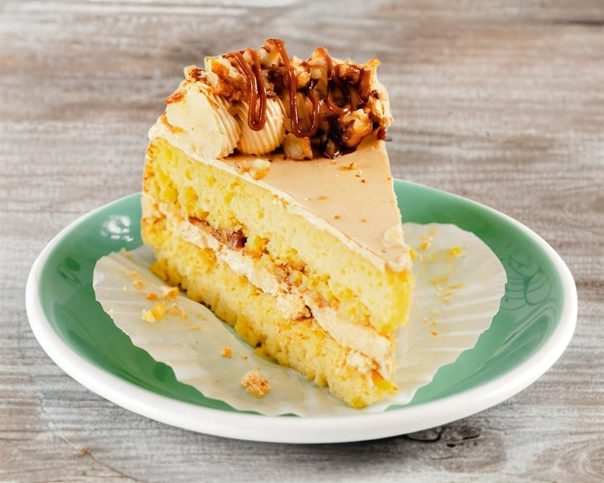 Pastel cremoso de elote con betún de dulce de leche y nuez garapiñada