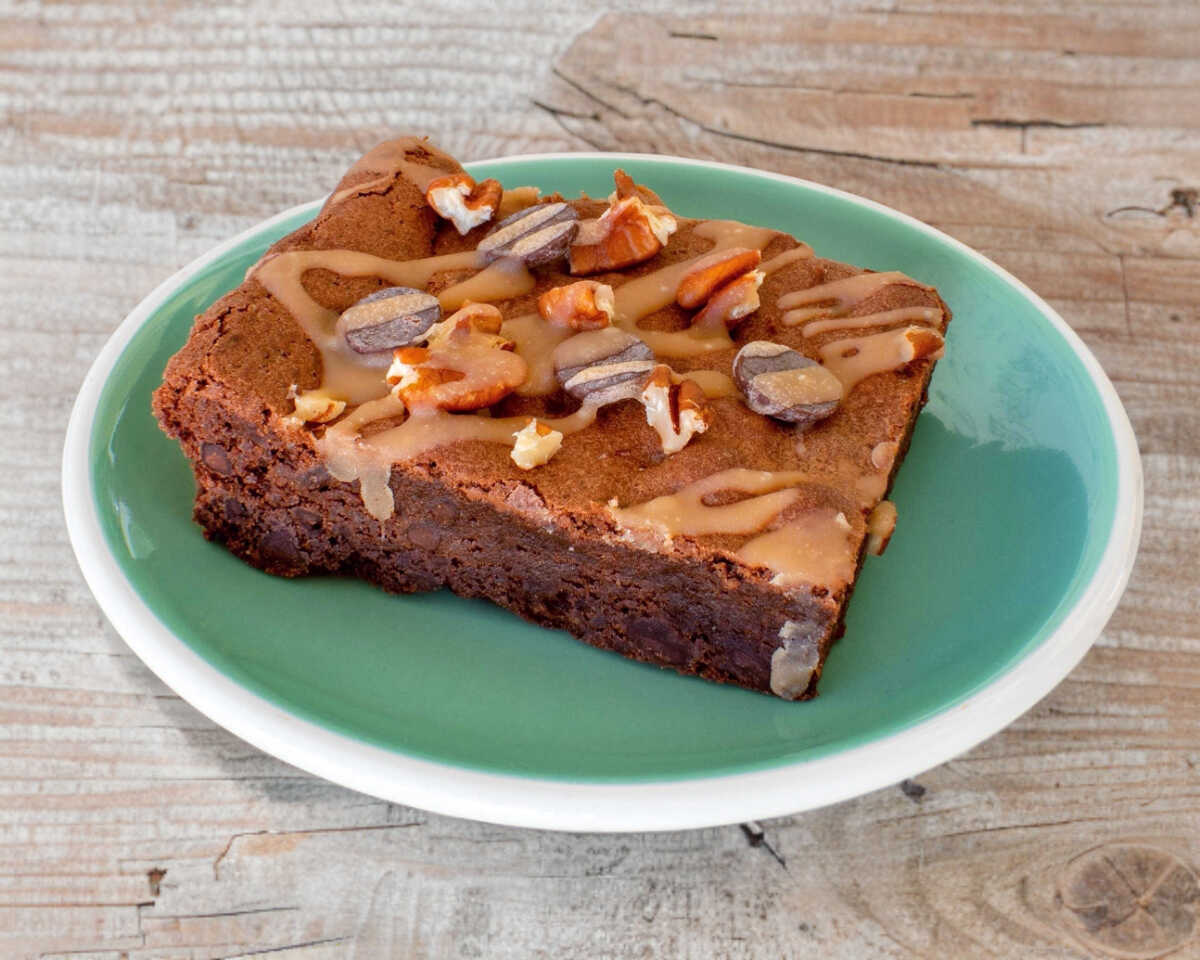 Delicioso brownie con topping de nuez, caramelo y chispas de chocolate.