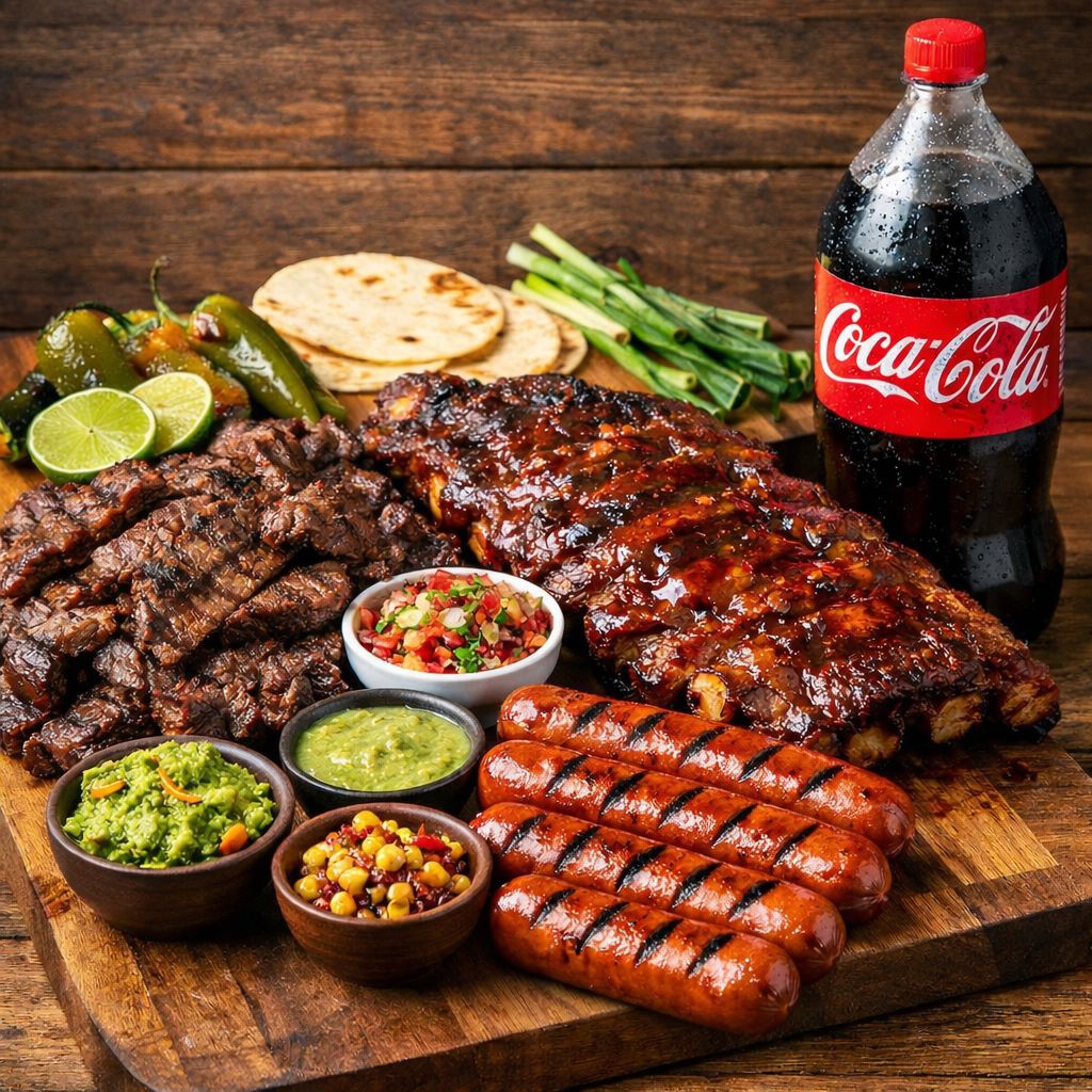 1 kilo de carne asada, 1 kilo de costilla asada/bbq, 2 ordenes de salchicha, 1 refresco 2 lts.
