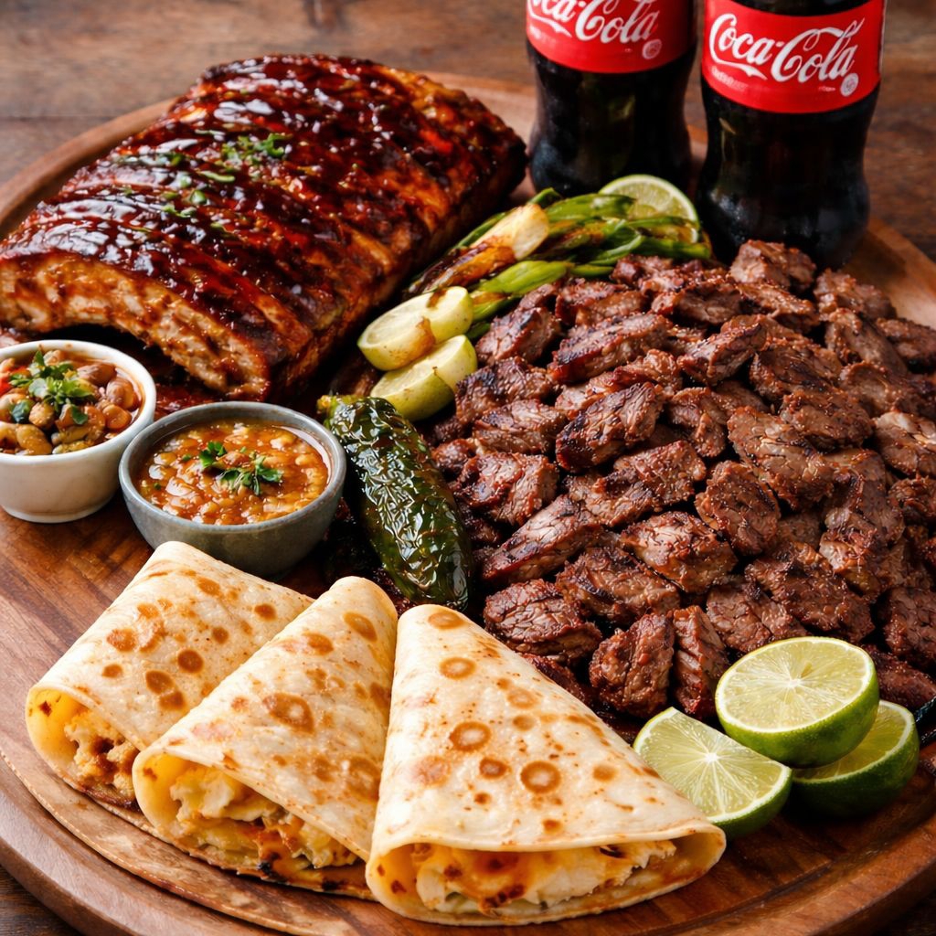 ½ costilla asada/bbq, ½ kg carne asada, 3 quesadillas h/m, 2 refrescos 600 ml.