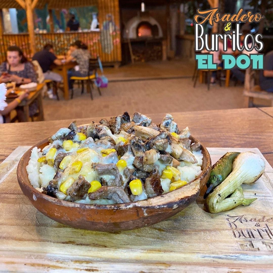 2 Carnes a elegir, queso gratinado, crema, elote y champiñones.