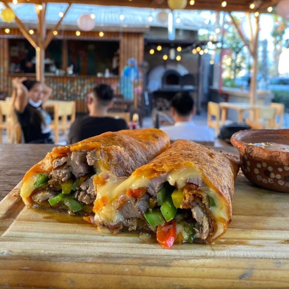 Tortilla de harina carne asada, pastor, pollo, lechuga, tomate, cebolla, crema, capsup, chile, salsa macha y queso. Porcion personal