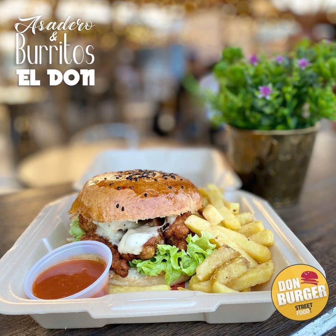 Carne de res, lechuga, tomate, cebolla, crema, cátsup, mostaza y chile.