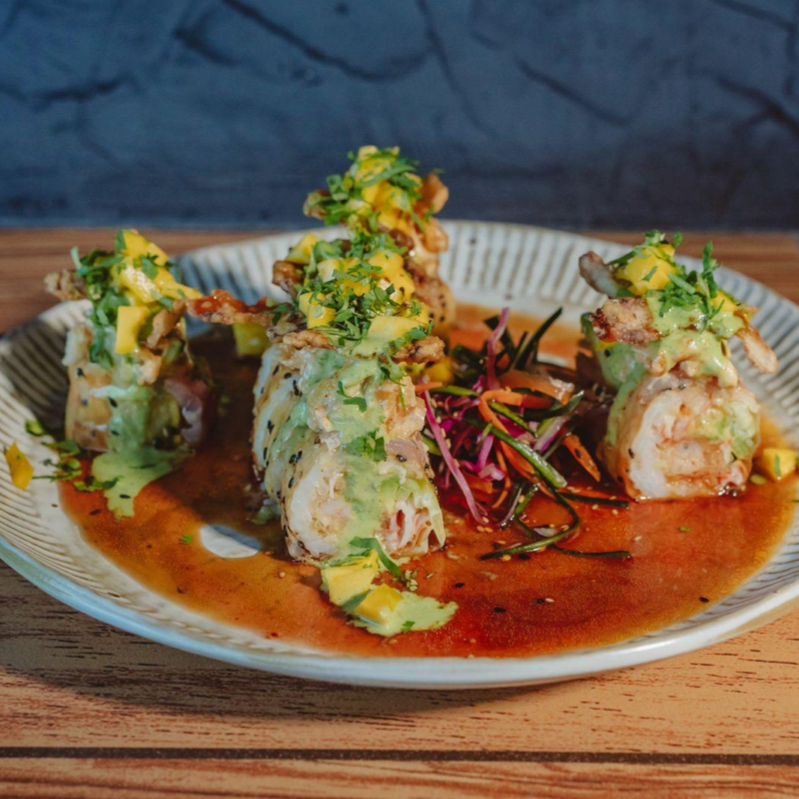 Aguacate, cangrejo spicy, por fuera envuelto en pescado fresco, topping de camarón tempura, mango y pulpo salteado, con salsa ponzu y curry.