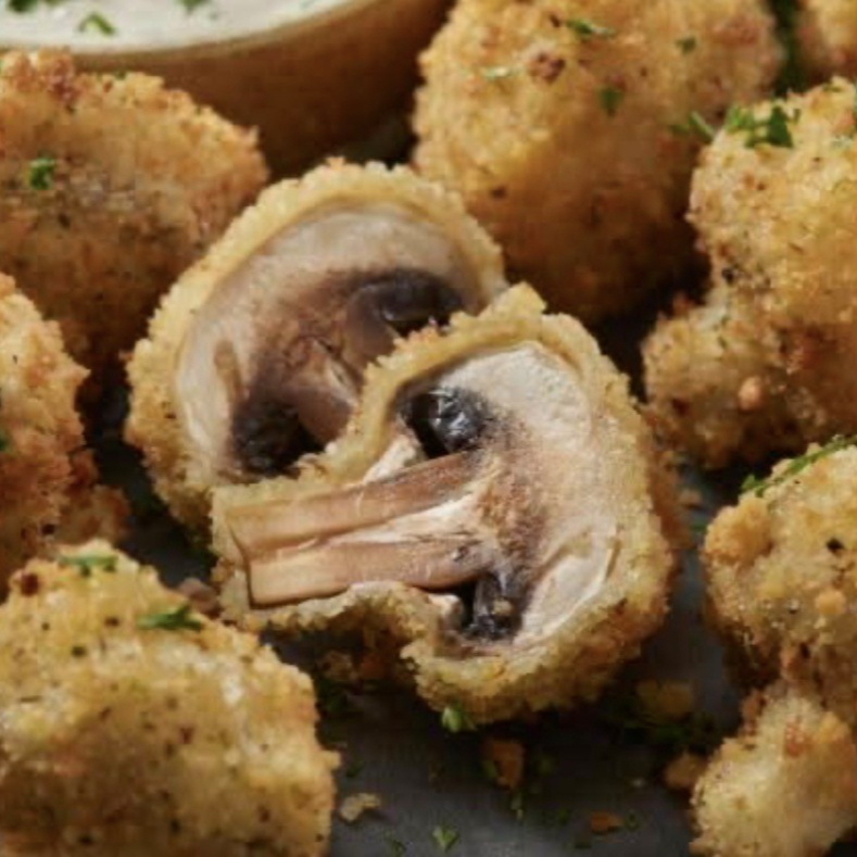 Jugosos champiñones empanizados y fritos al momento. Acompañados de tu salsa favorita.