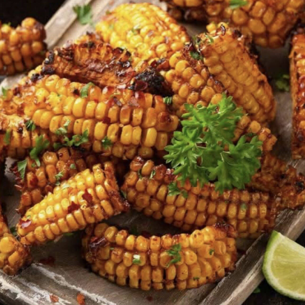Tiras de elote frito, sazonadas con especies y bañadas en aderezo de cilantro y chipotle cremoso. Terminadas con un toque de perejil.