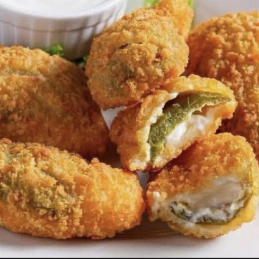 Seis jalapeños rellenos de queso crema, empanizados y crujientes, servidos con ranch.
