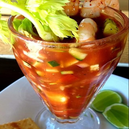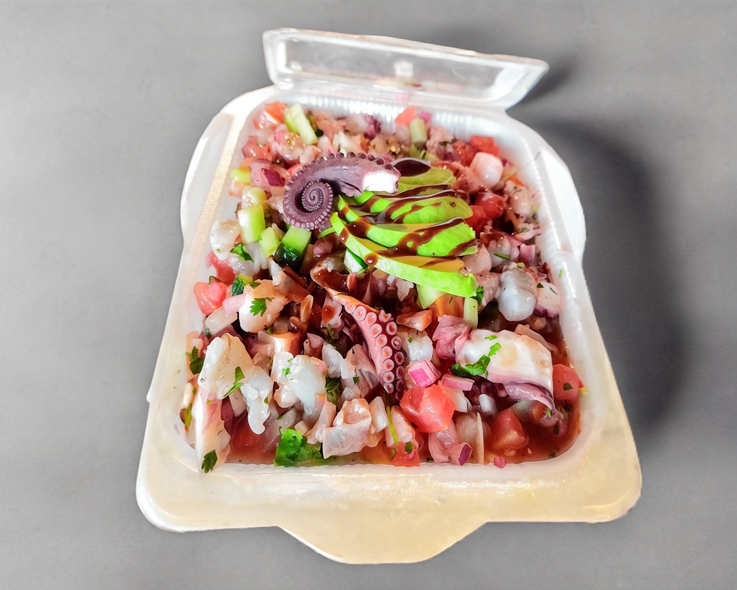 Preparado con camarón crudo, camarón cocido, pulpo, callo, caracol, almeja, pescado, pepino, cebolla morada y salsa de la casa