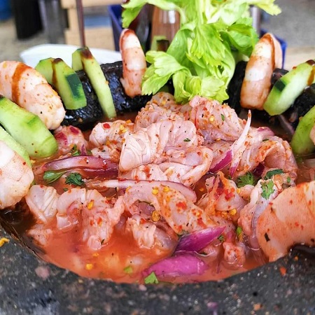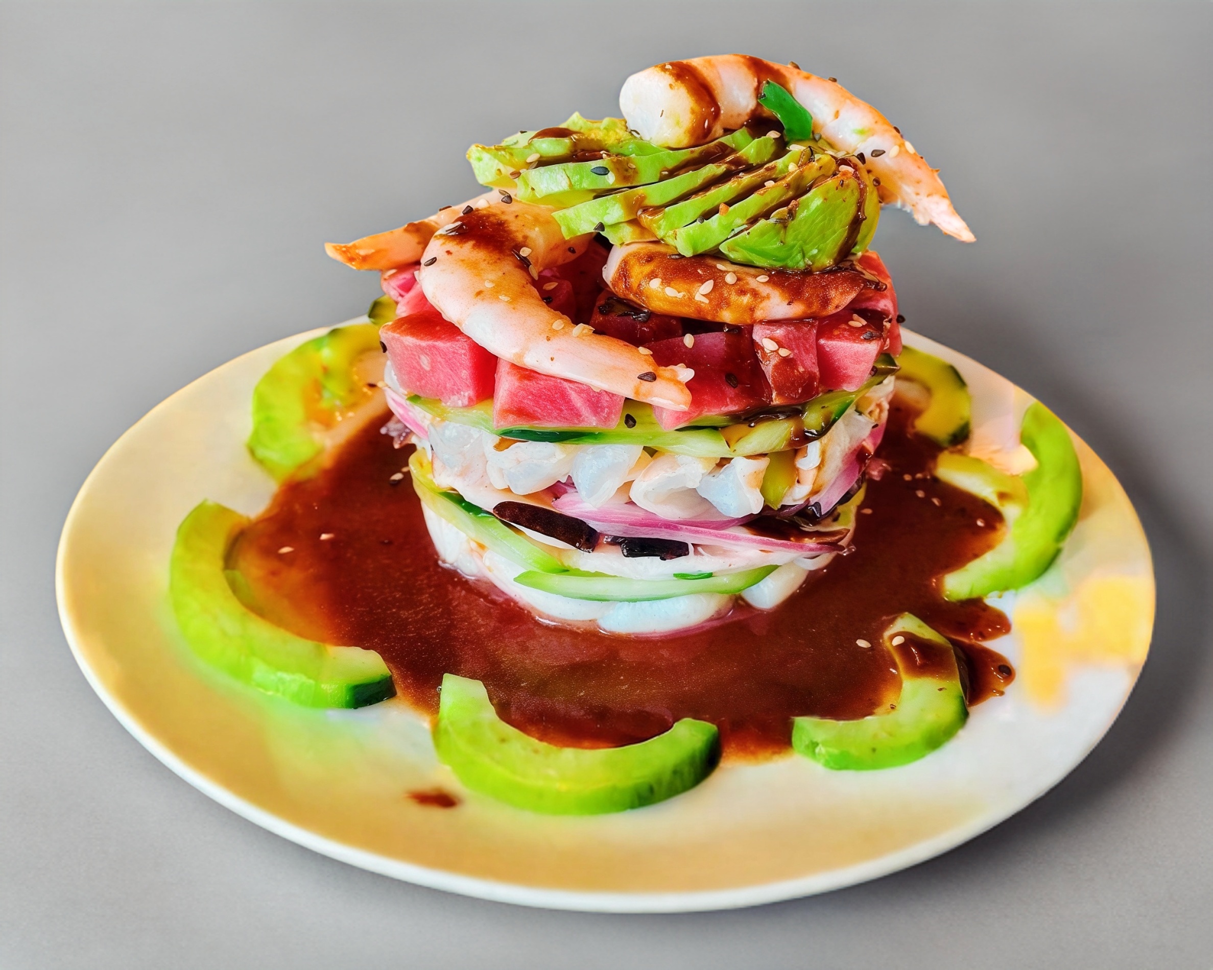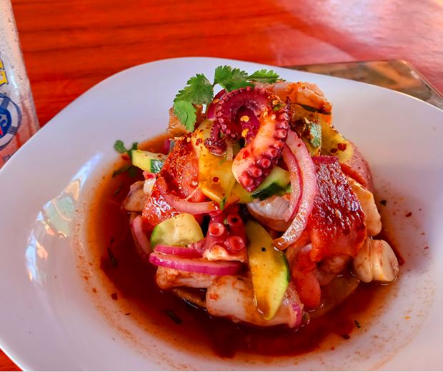 Base de ceviche de camarón con pescado., relleno con una mezcla de camarón crudo, camarón cocido, pulpo, atún, camarón con cabeza, pepino, cebolla morada, y salsa de la casa