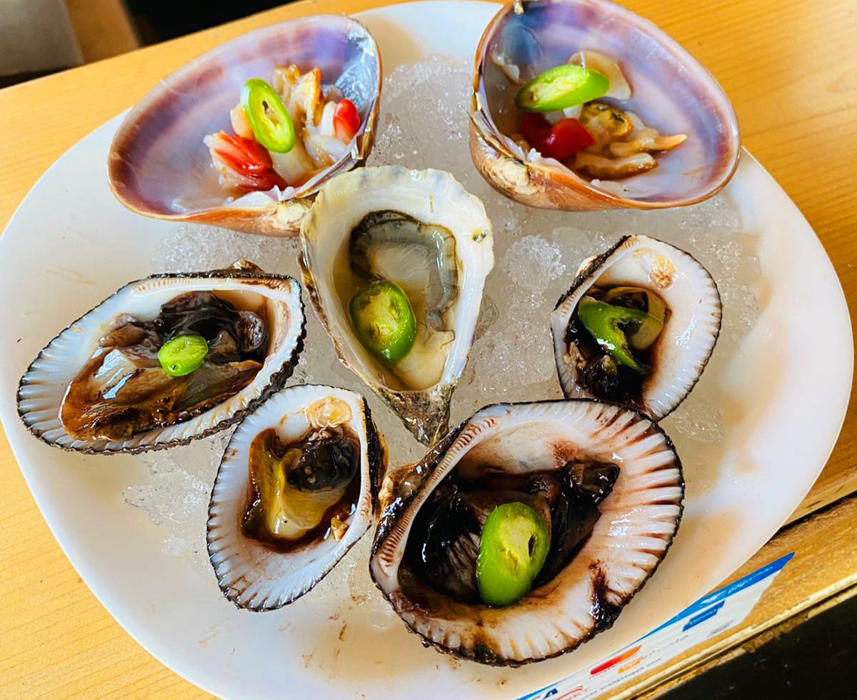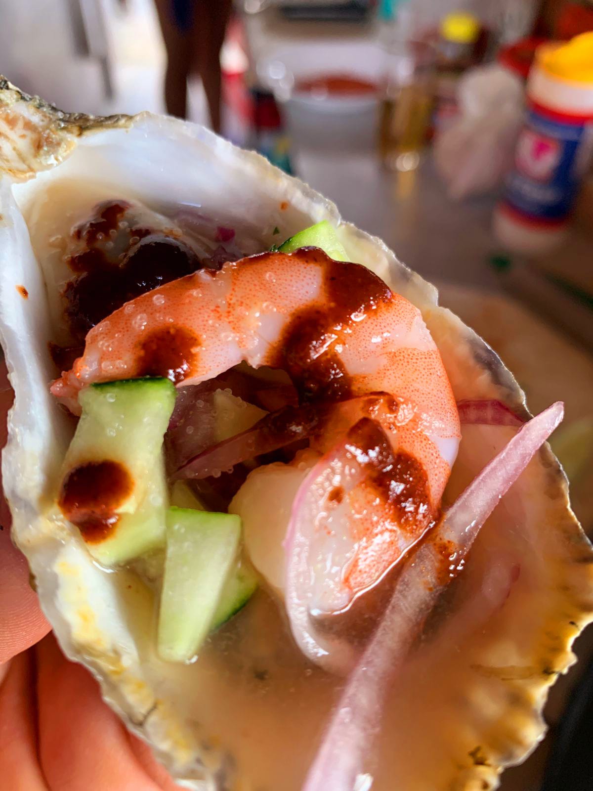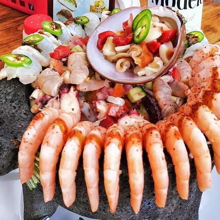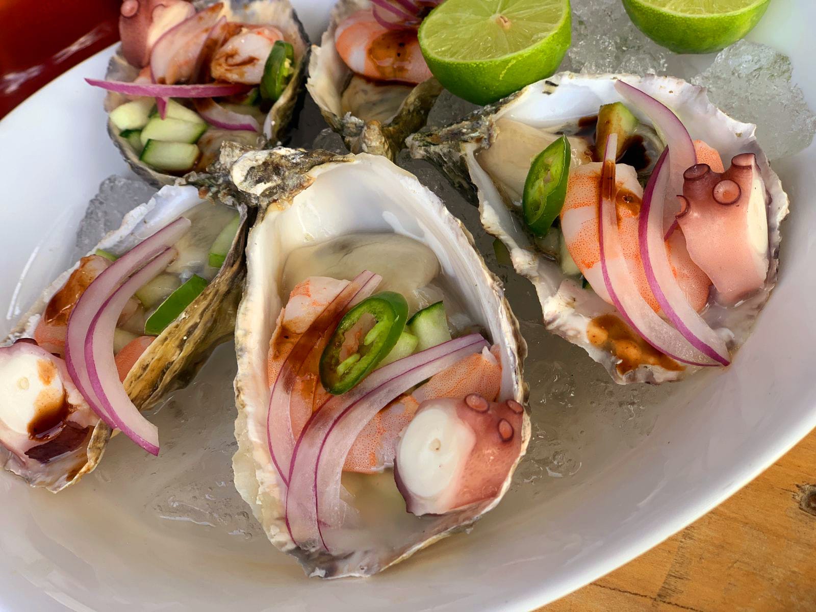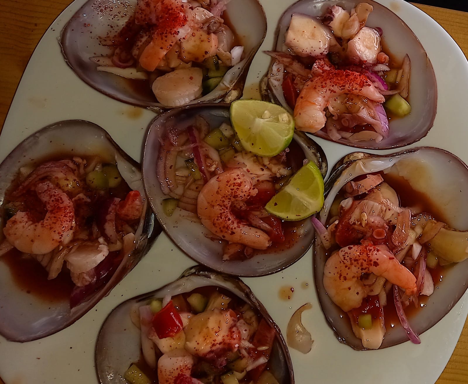 Ceviche al centro decamaron crudo y cocido,pulpo y callo,cevicd de almeja en suconcha,2ostiones,2 patas de mula,camarones para pelar
