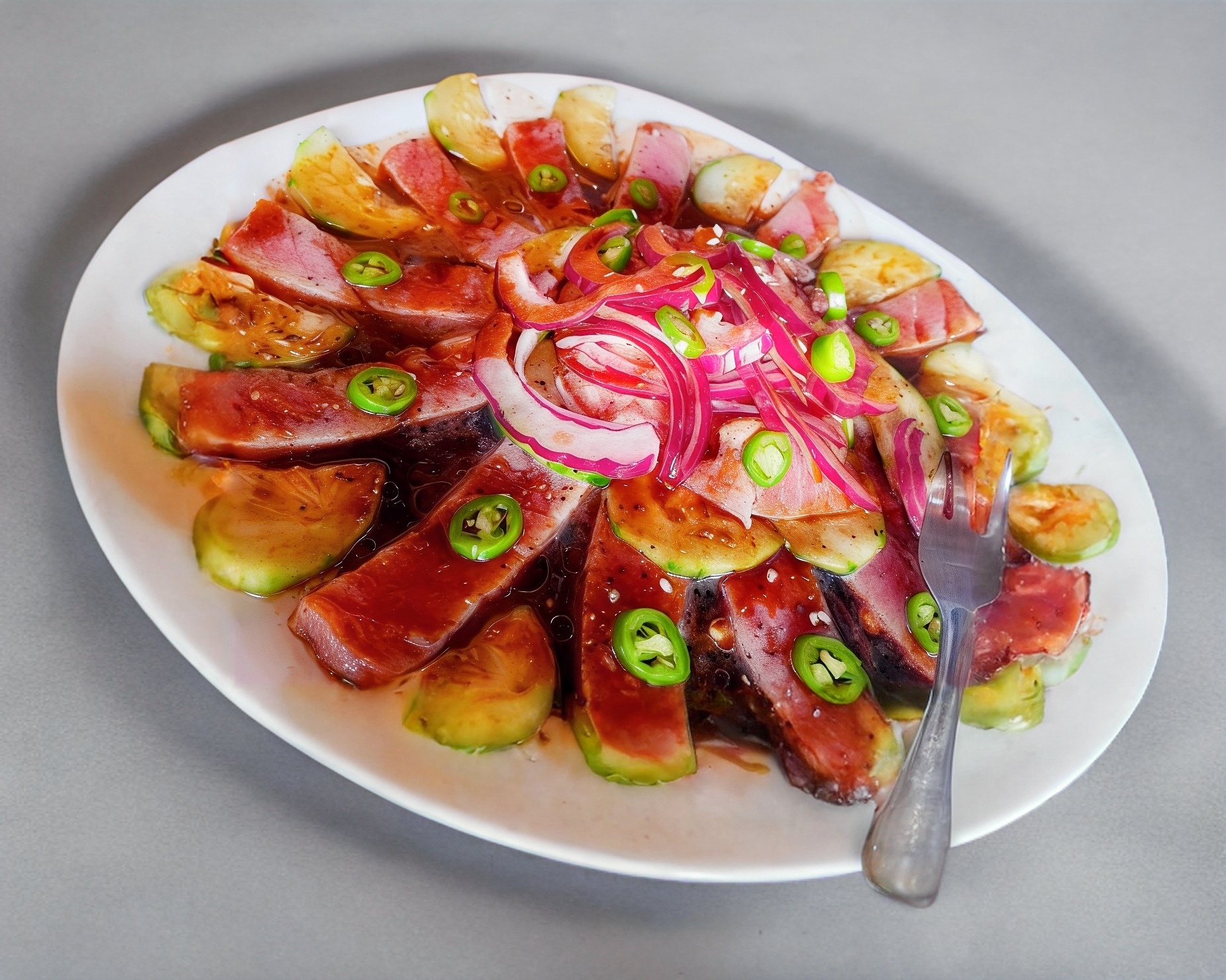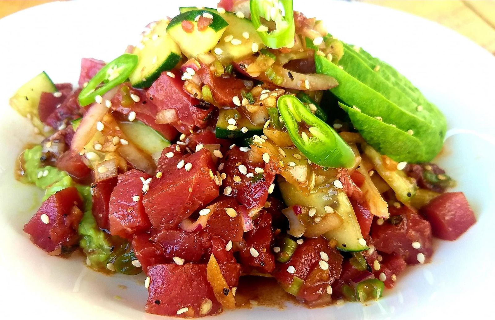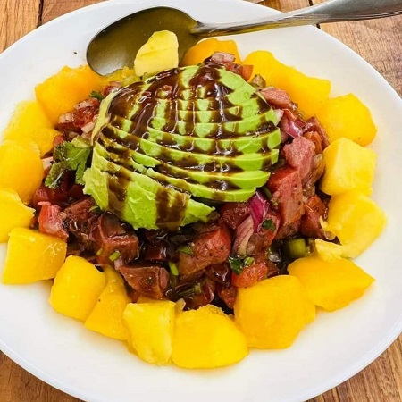 Ceviche de atun con mango,pepino,jitomate,cebolla,cilantro y aguacate