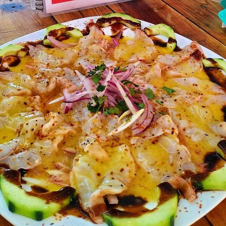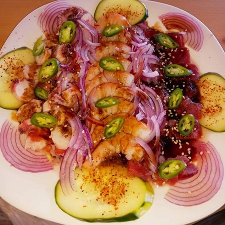 Laminas de atun,camaron cocido,camaron crudo,cebolla morada, aguacate y serrano