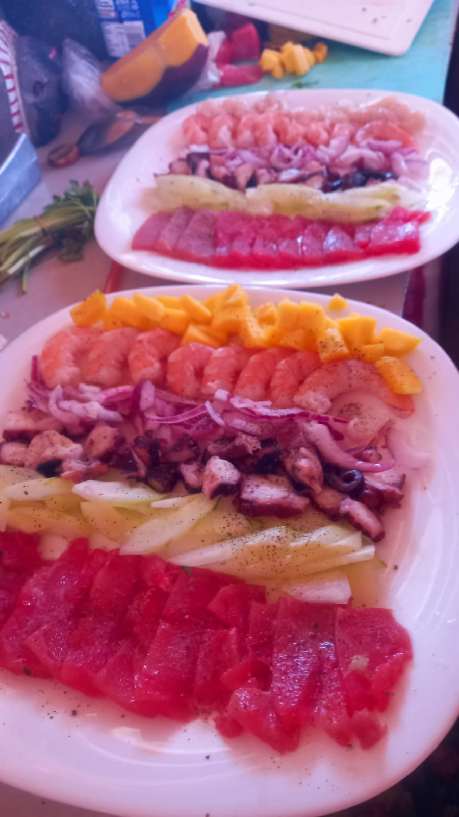 Camaron crudo y cocido. Pulpo. Callo caracol atun cebolla pepino y salseado de la casa