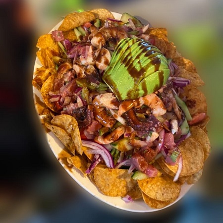 Cama de tostitos con pepino,cebolla morada,camaron crudo,camaron cocido,pulpo y atun, aguacate y salseado de la casa