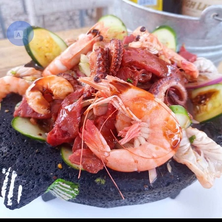 Camaron cocido pulpo ostion con salsa picante y verduras