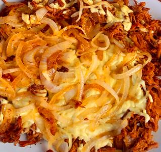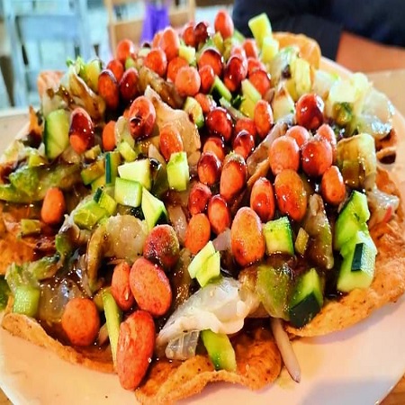 Una cama de tostitos. Camarones ahogados. Pepinos. Cacahuates. Cebolla morada y salsa de la casa