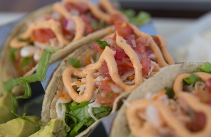 tacos de camaron con pina rostizada guacamole y queso gratinado