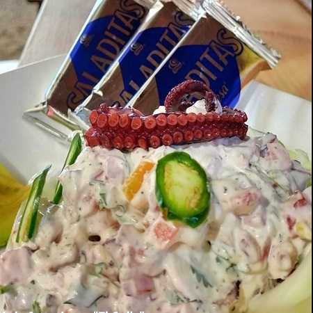 Pulpo crema mayonesa tomate cebolla morada cilntro serrano
