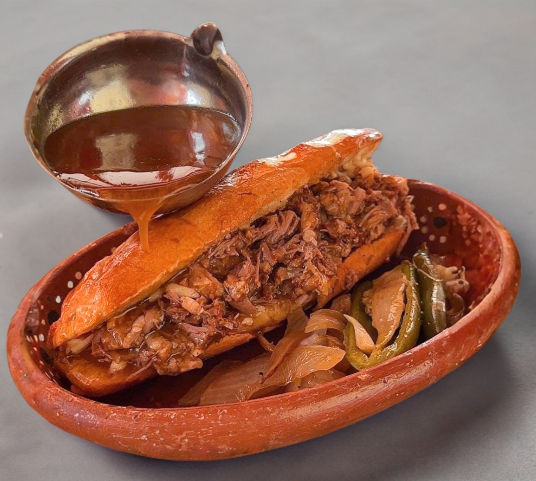 birote salado de gdl con queso y birria incluye un consome de 10 oz salsas y verdura