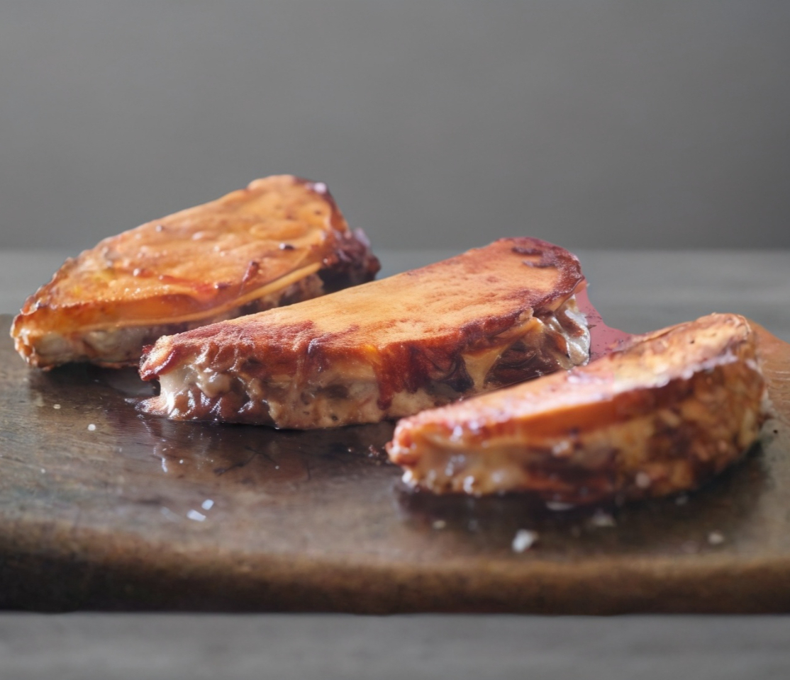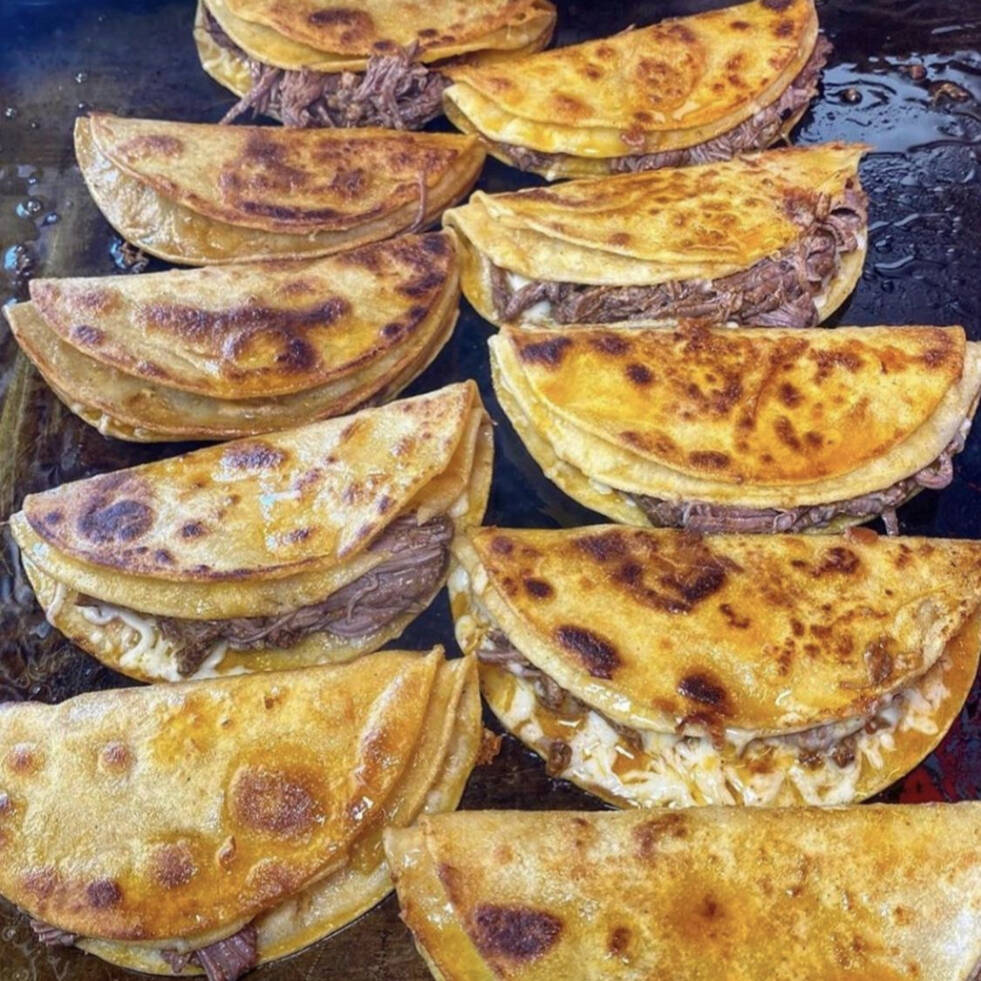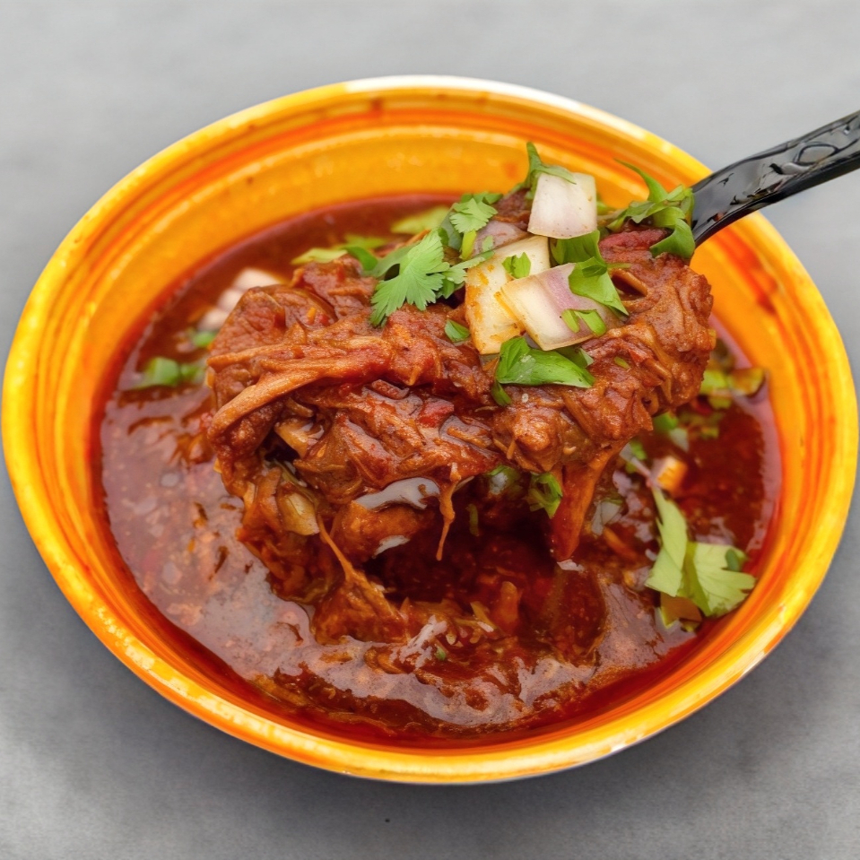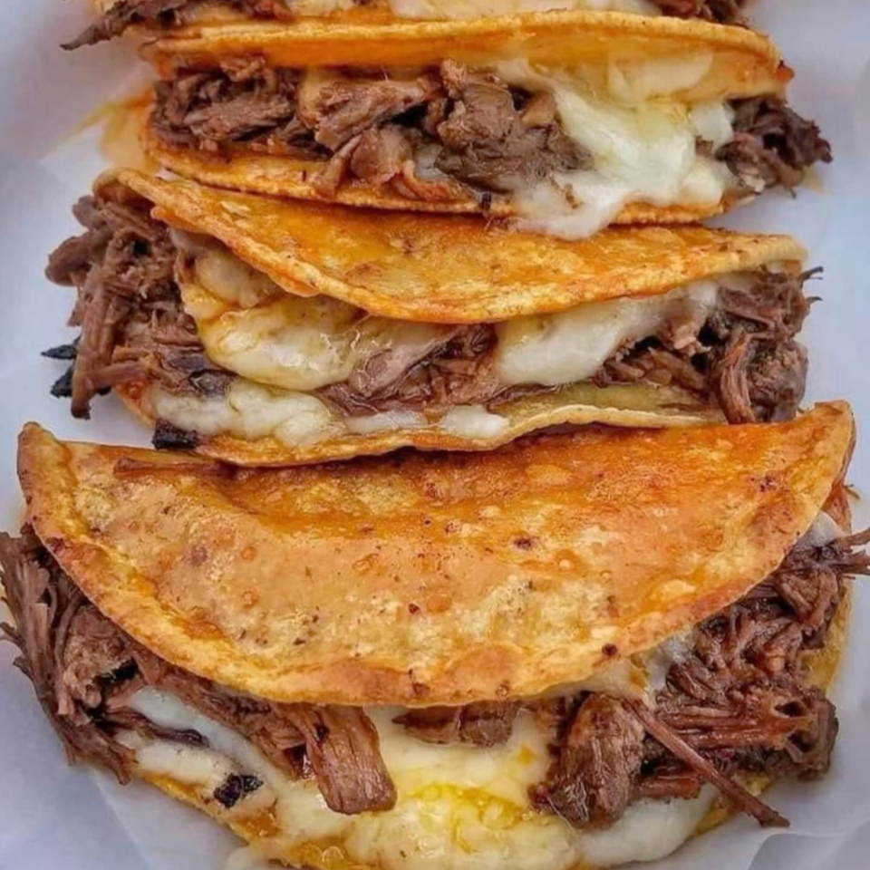 totopos bañados en salsa,con queso gratinado,birria y cebolla morada