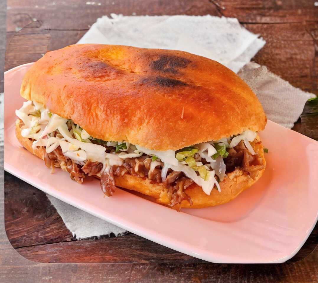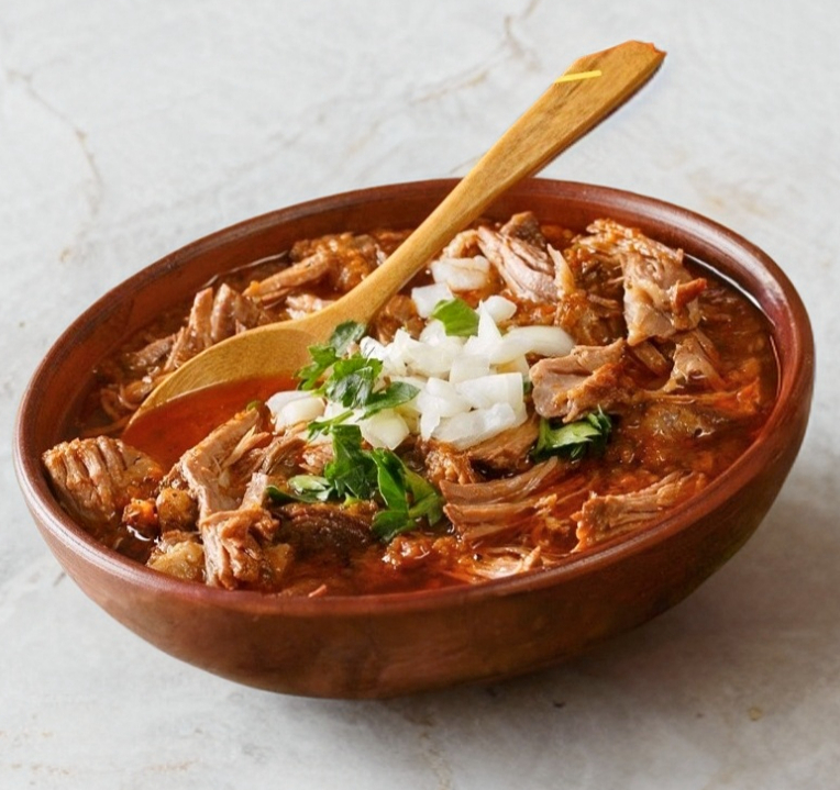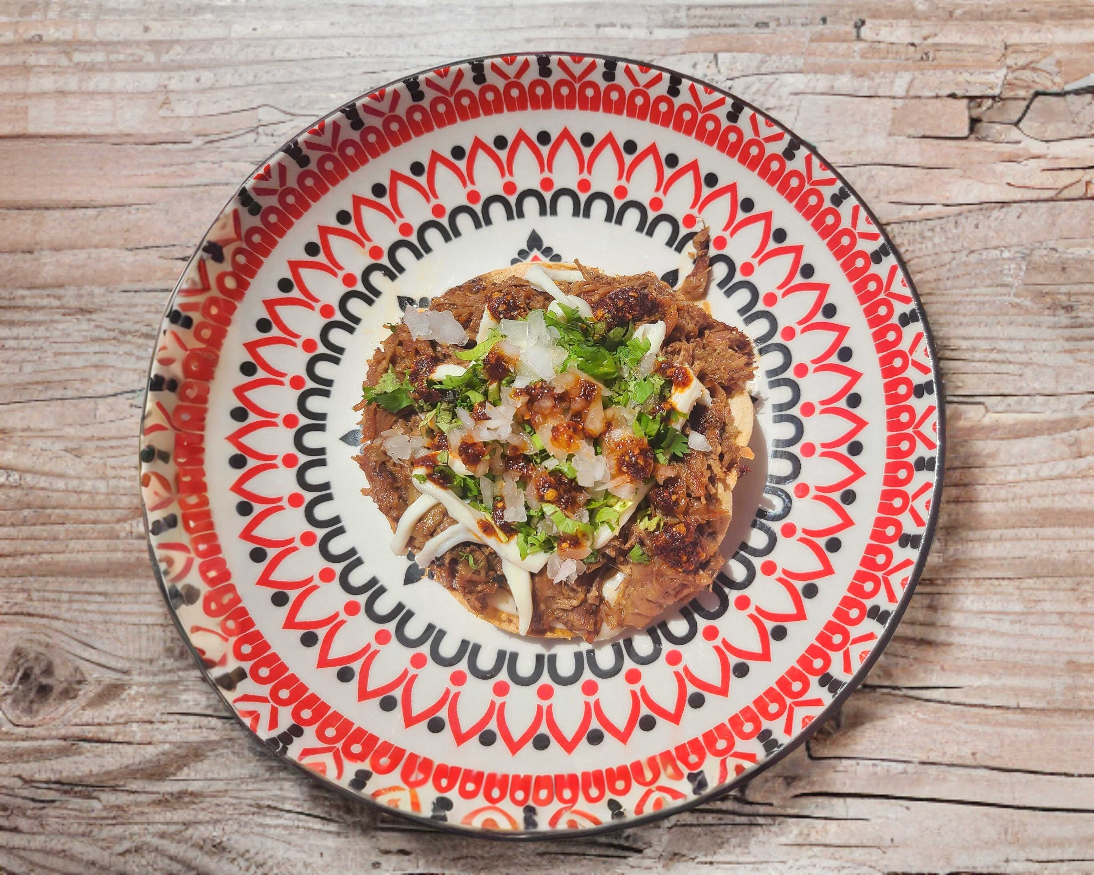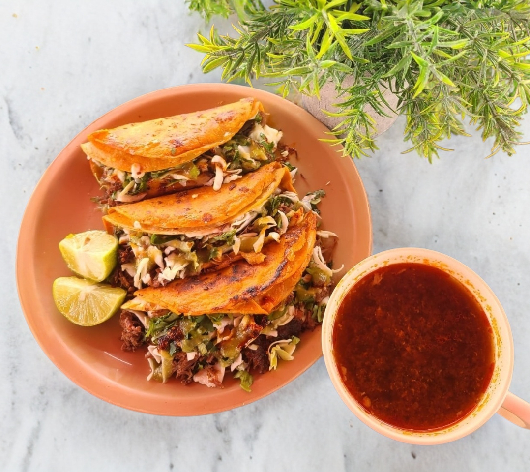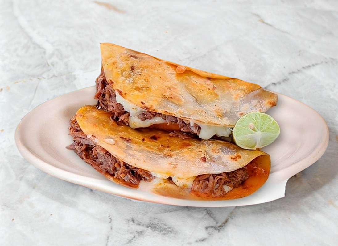 Tortillas doradas o semidoradas, birria, queso gratinado con cebolla, cilantro y limón.