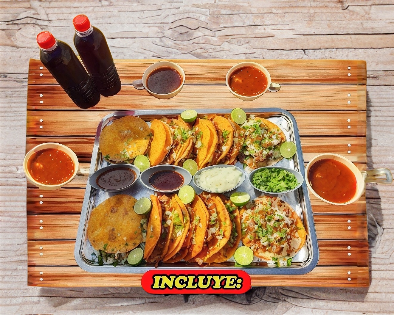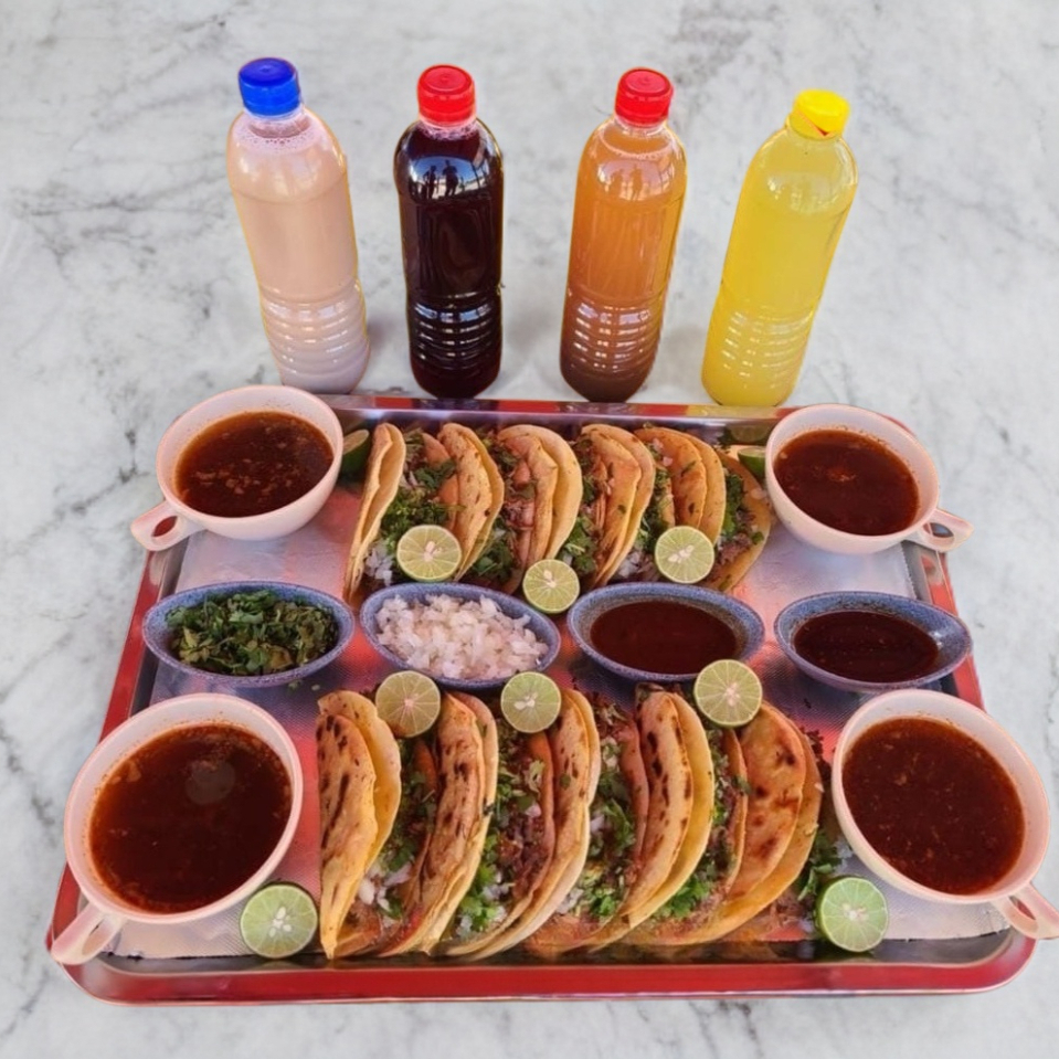 4 Tacos, 4 quesabirrias, 4 consomés, 2 gringas, 2 volcanes y 2 aguas.