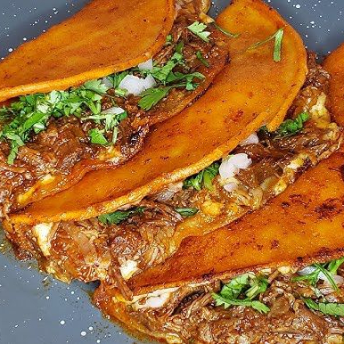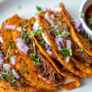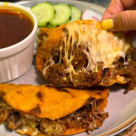 Tortilla de maíz dible con queso mozzarella, carne de res bañada en consomé.