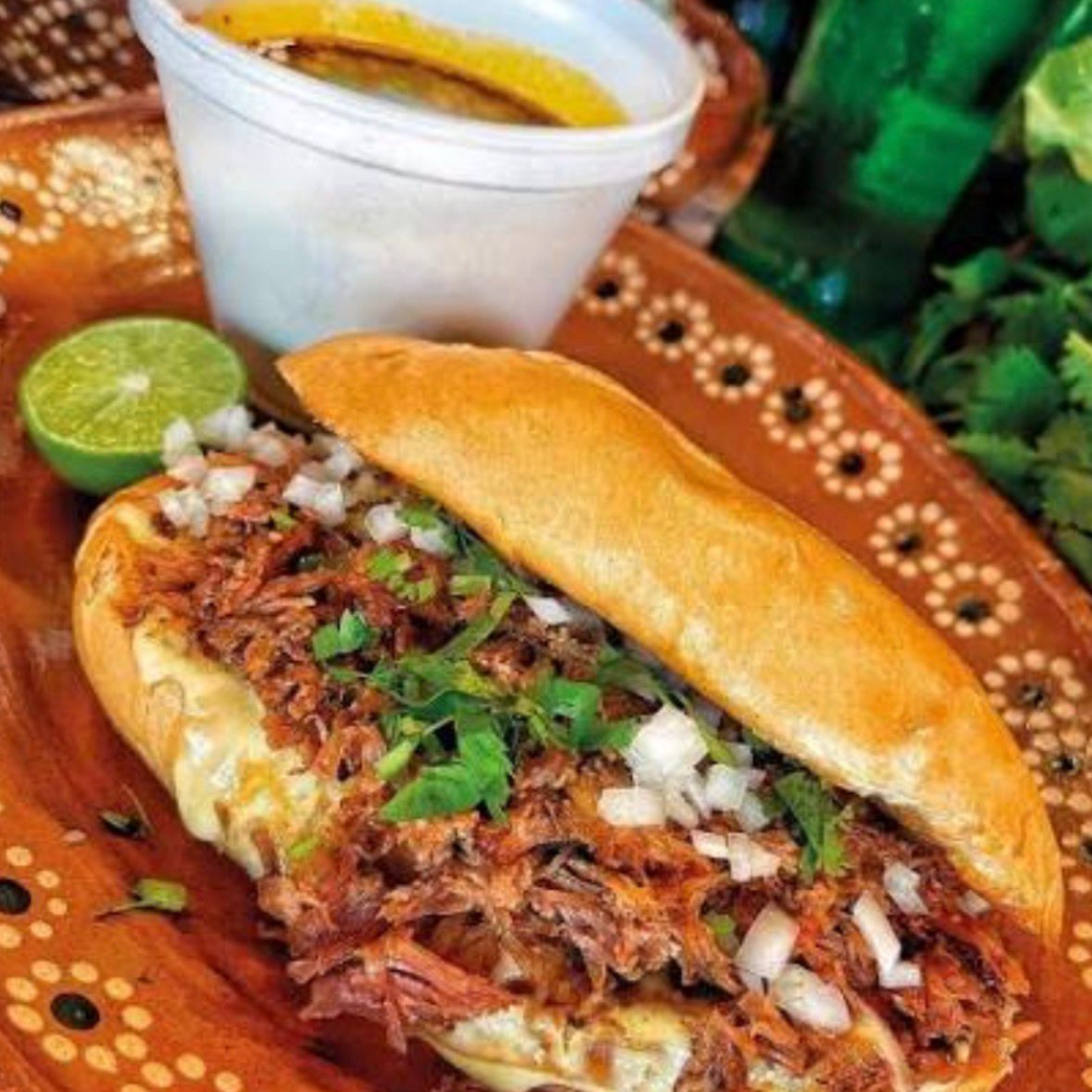 Tortilla de maíz doble con queso mozzarella, carne de res bañada en su consomé.