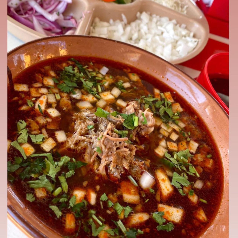 Tradicional caldo de panza de res condimentado con chiles secos y especias.