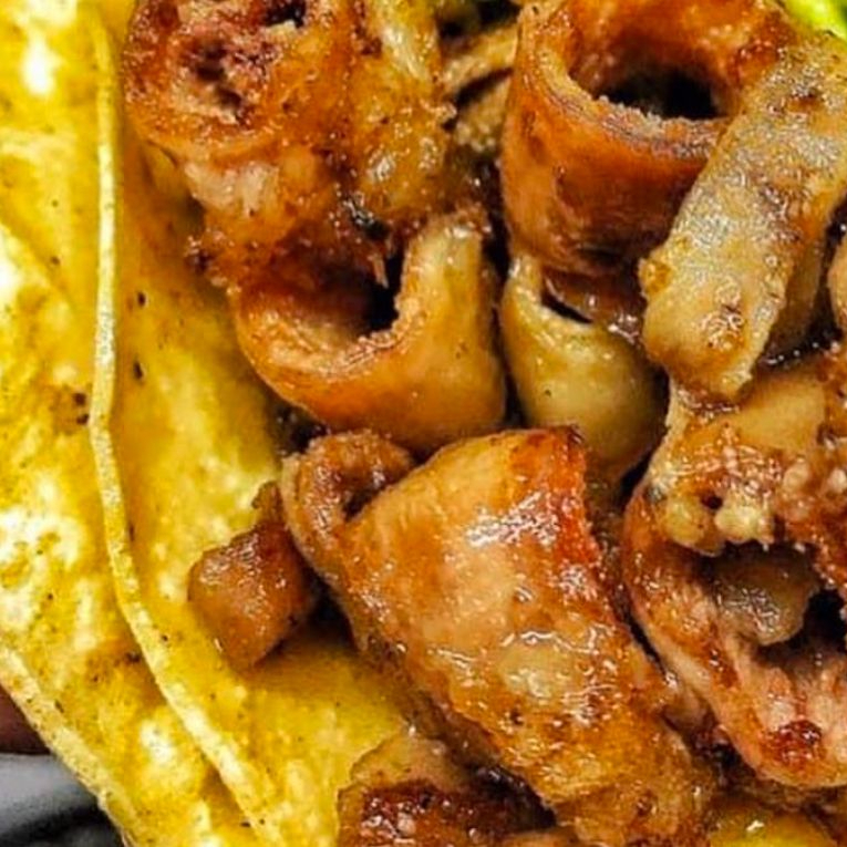 Combinación de tortilla tostada, queso derretido y tripa bien dorada.