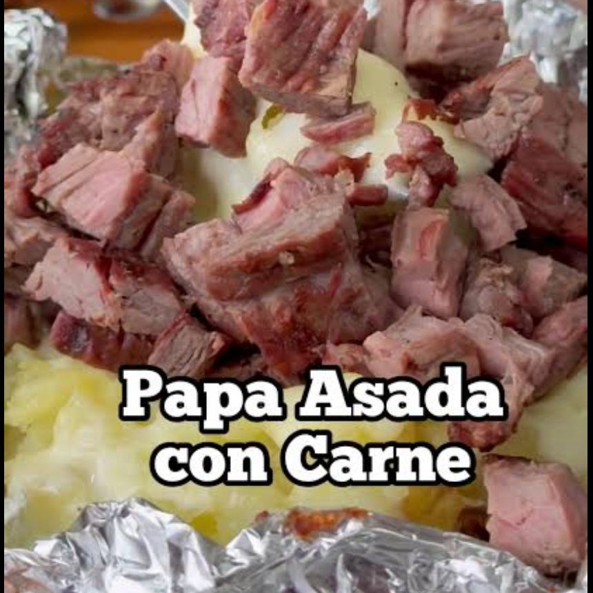 Papa horneada y machacada con mantequilla, rellena de carne asada y queso.