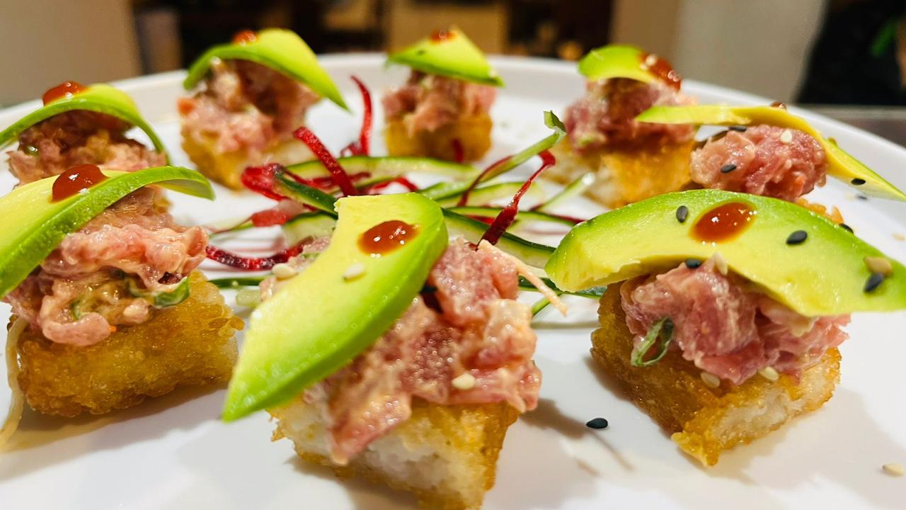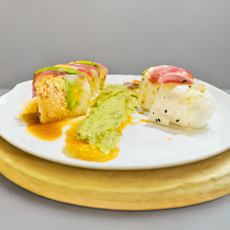 Aguacate, pepino, spicy tuna, pulpo frito por dentro,topping de spicy tuna y finas rebanadas de pulpo salteado con un toque de cilantro, acompañado de salsa karague y limon de aceite curri