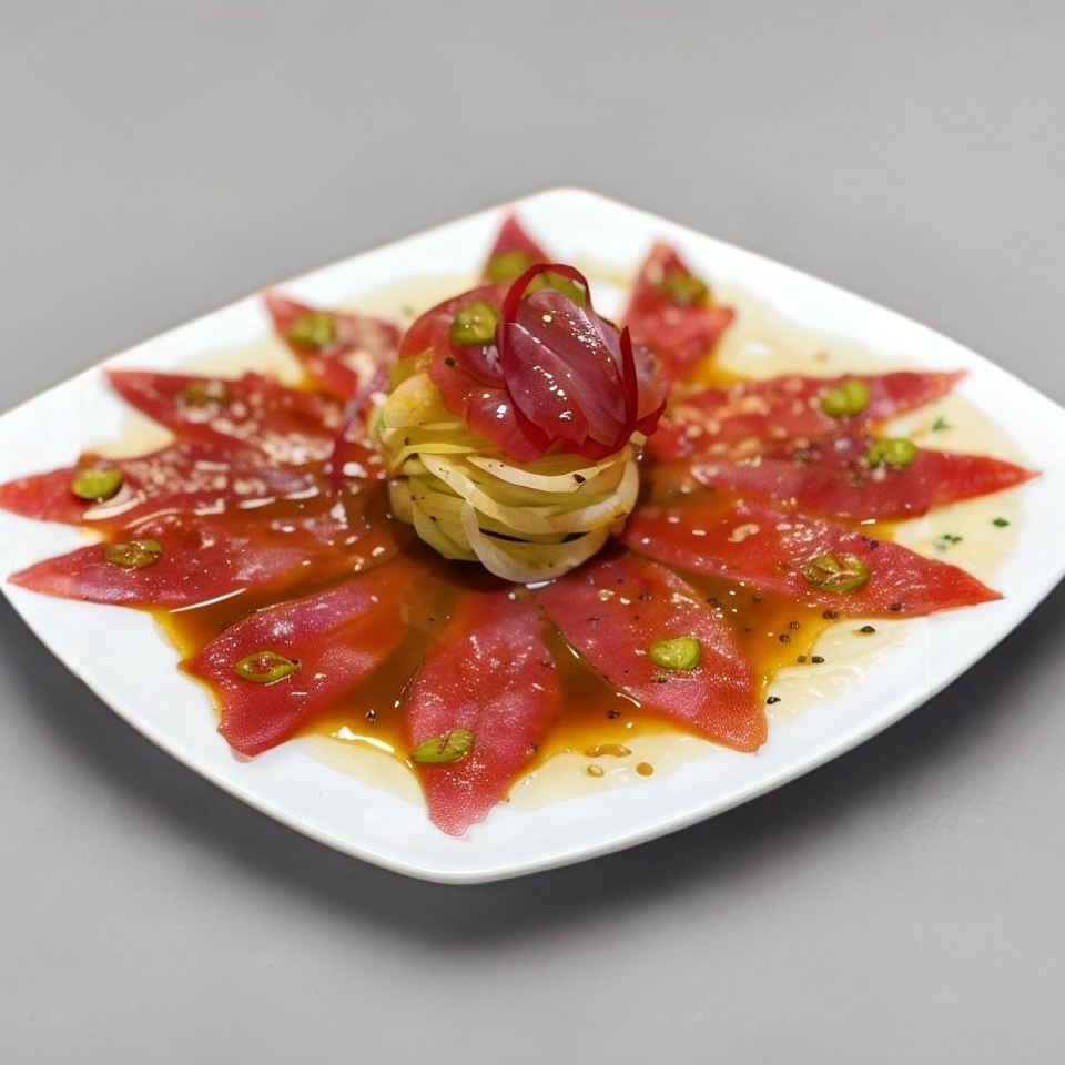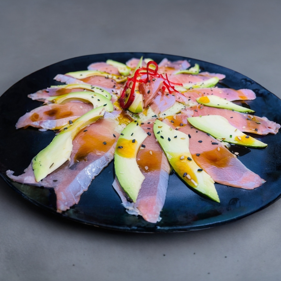 Finas rebanadas de pescado, aguacate, spicy de cangrejo en salsa yuzo