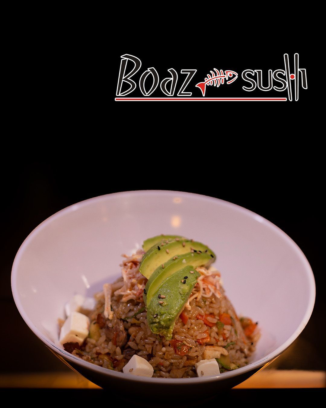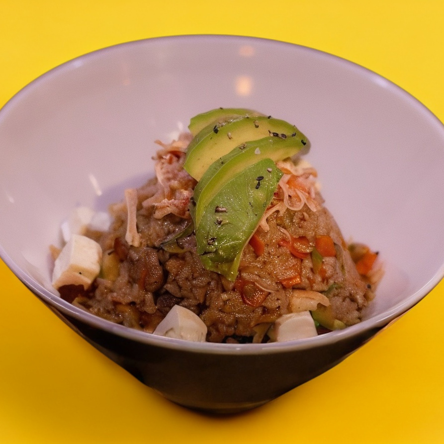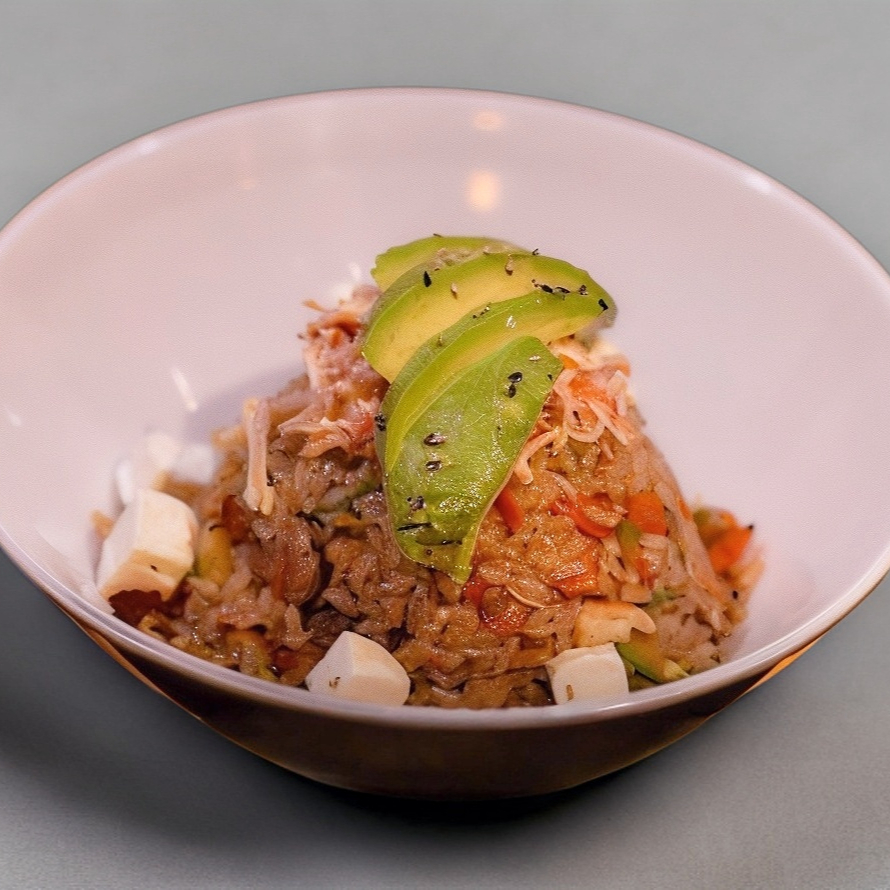 Arroz frito con spicy de pescado y laminas de aguacate