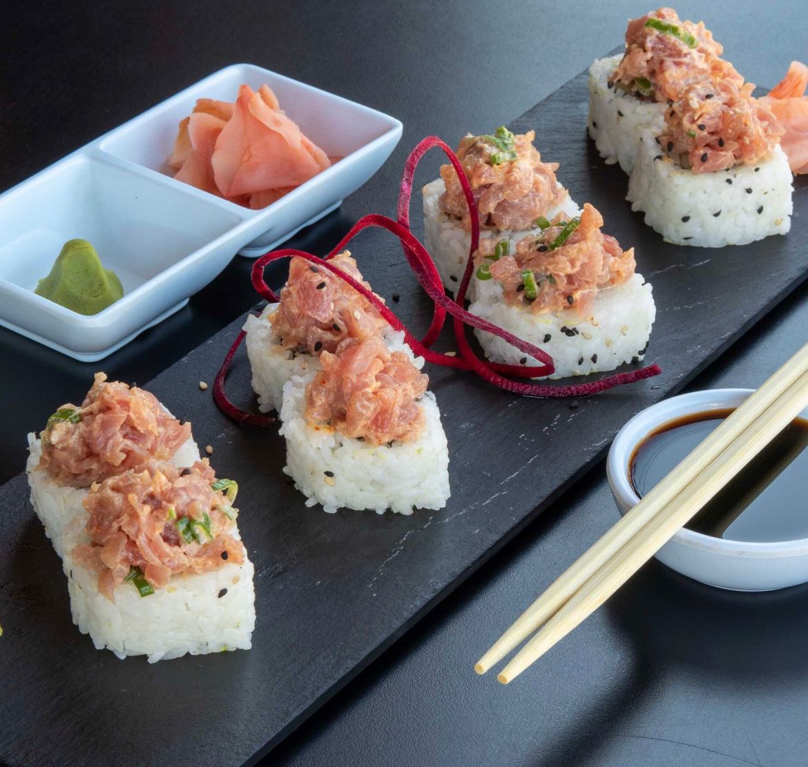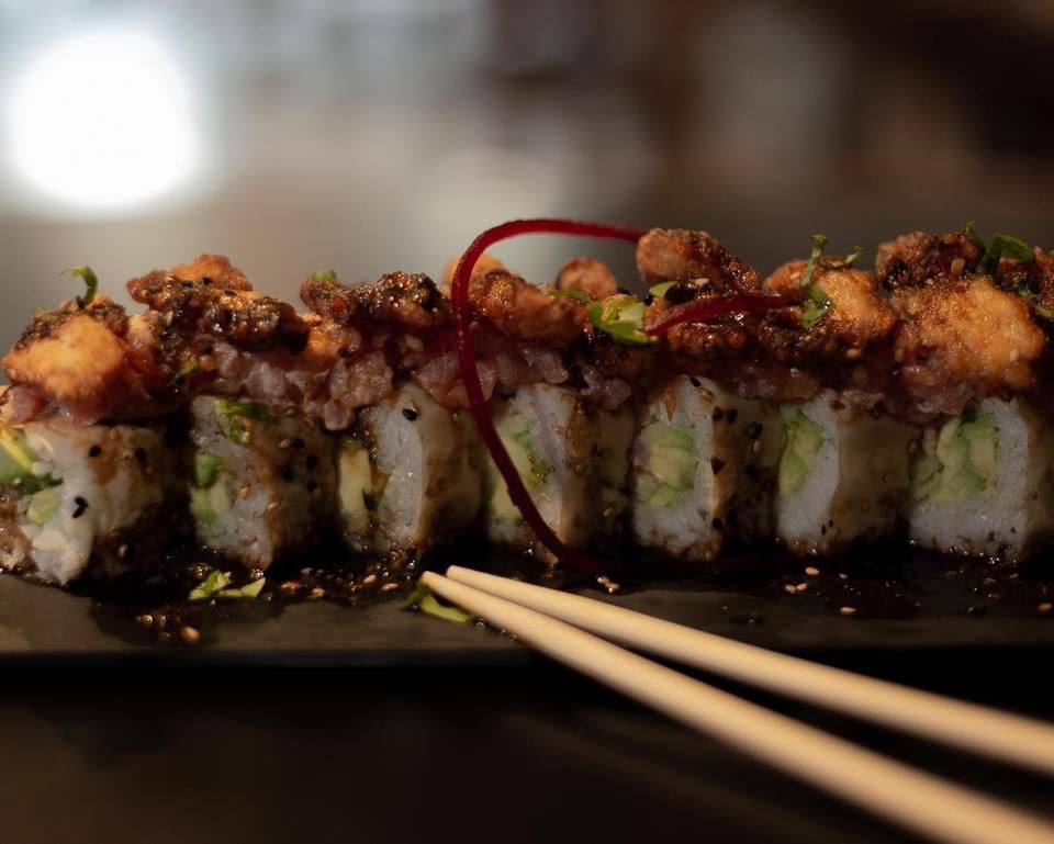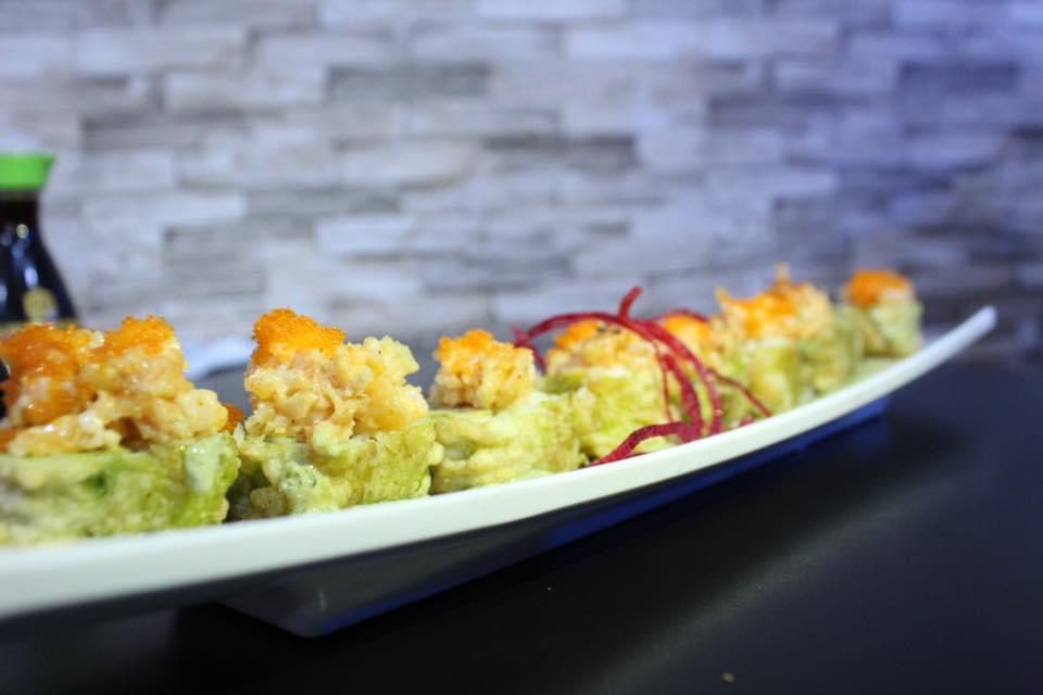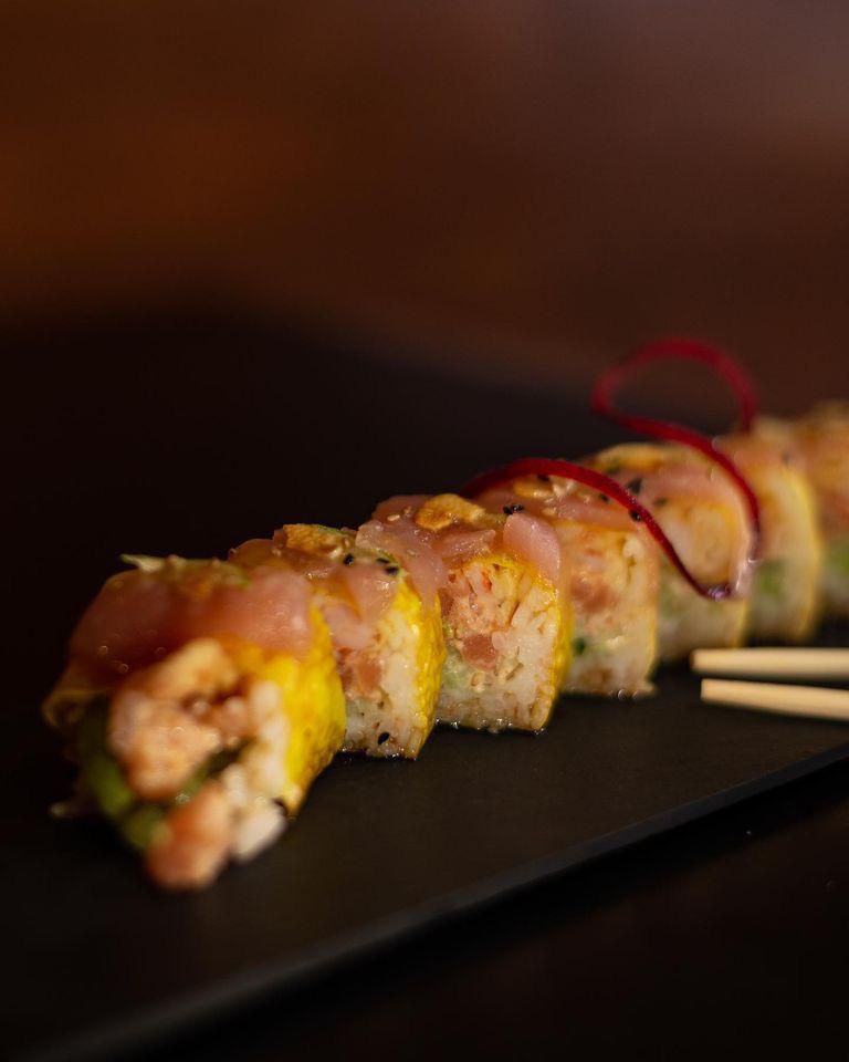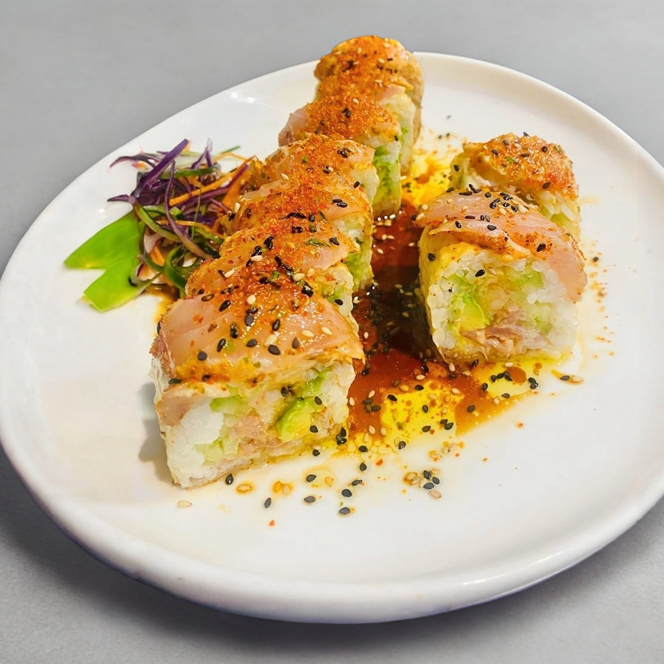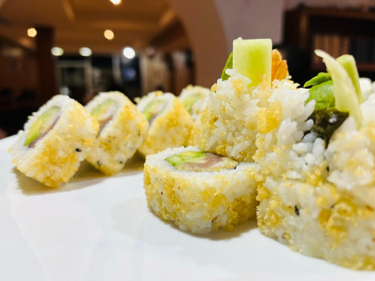 Aguacate, pepino, spicy tuna y cangrejo, camaron tempura por dentro, cubierto de pescado sellado con chile de aceite curri y soya preparada