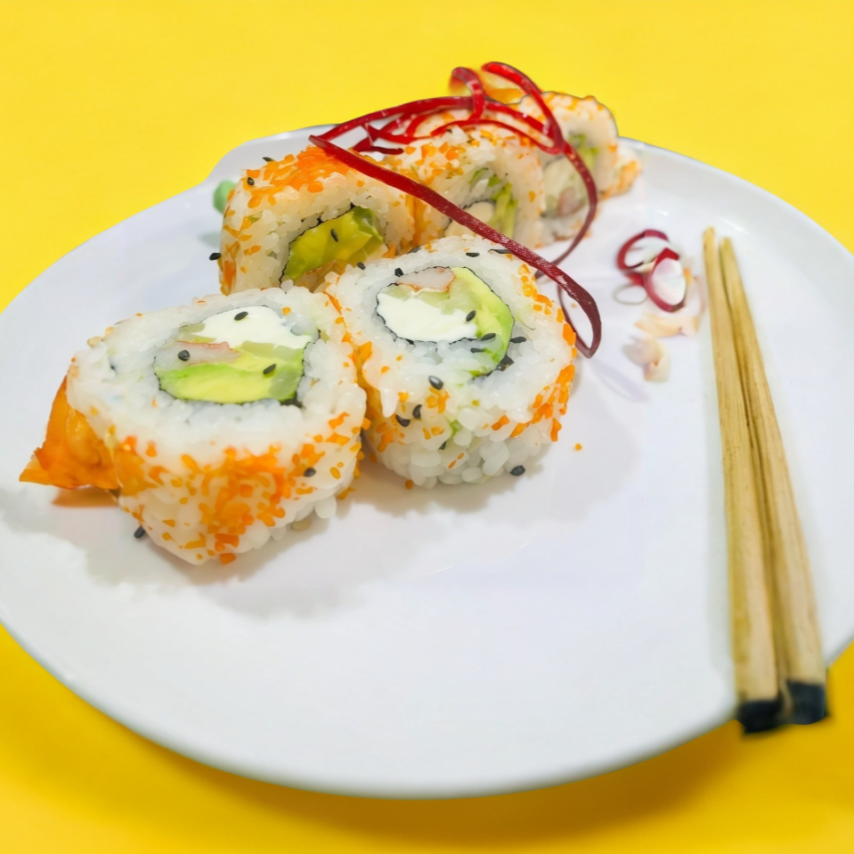 Aguacate, pepino, philadelphia, cangrejo, cubierto de masago.