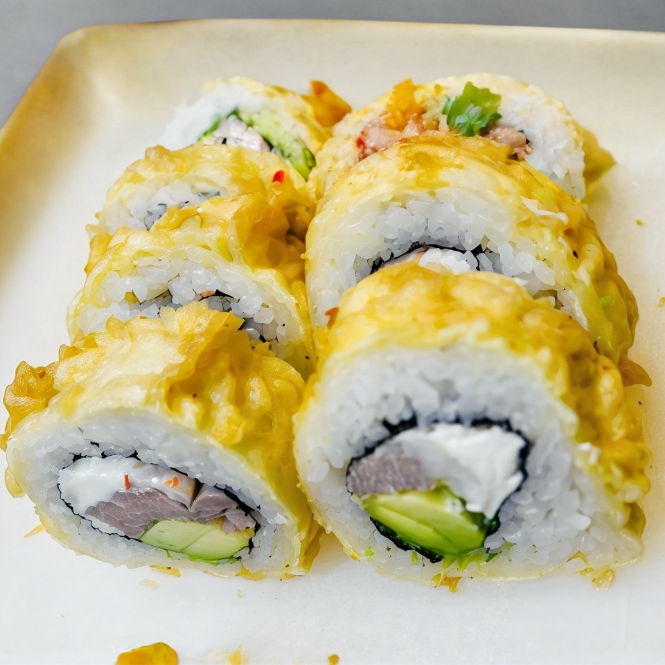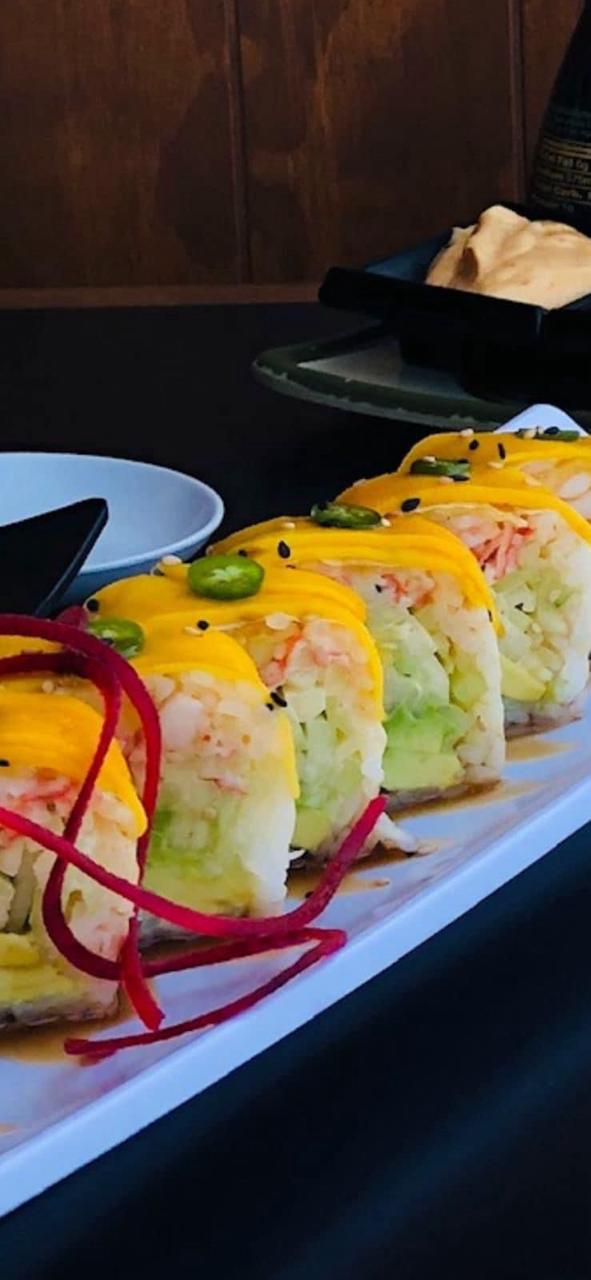 Queso Crema, aguacate, pepino spicy de cangrejo, camaron tempura, cubierto de mango, finas rodajas de chile serrano, salsa de anguila