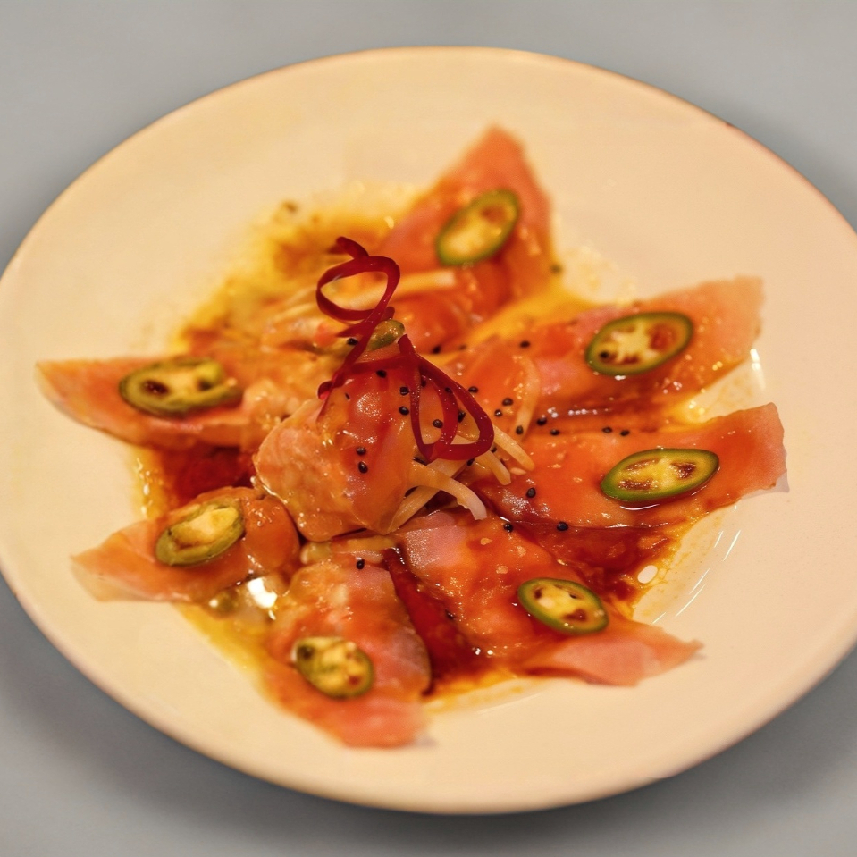 Pescado Fresco, finas rodajas de chile serrano con aderezo serranito