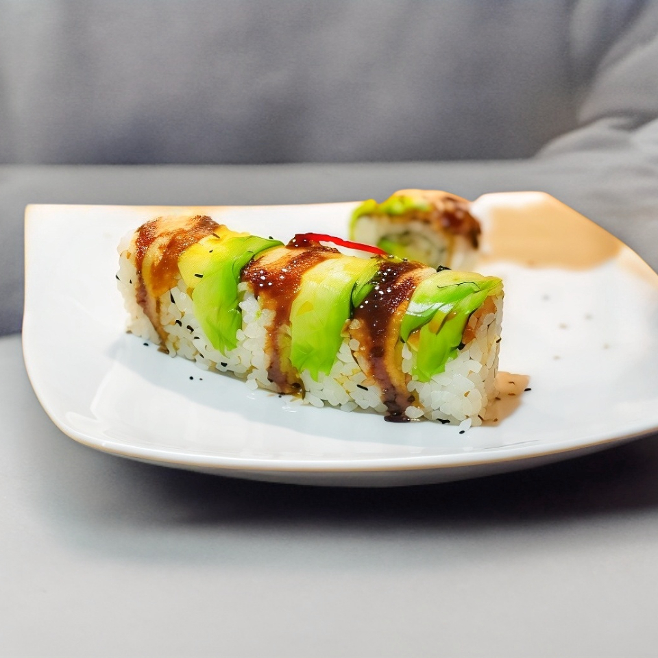 Aguacate, pepino, pescado, camaron tempura y salsa de anguila.