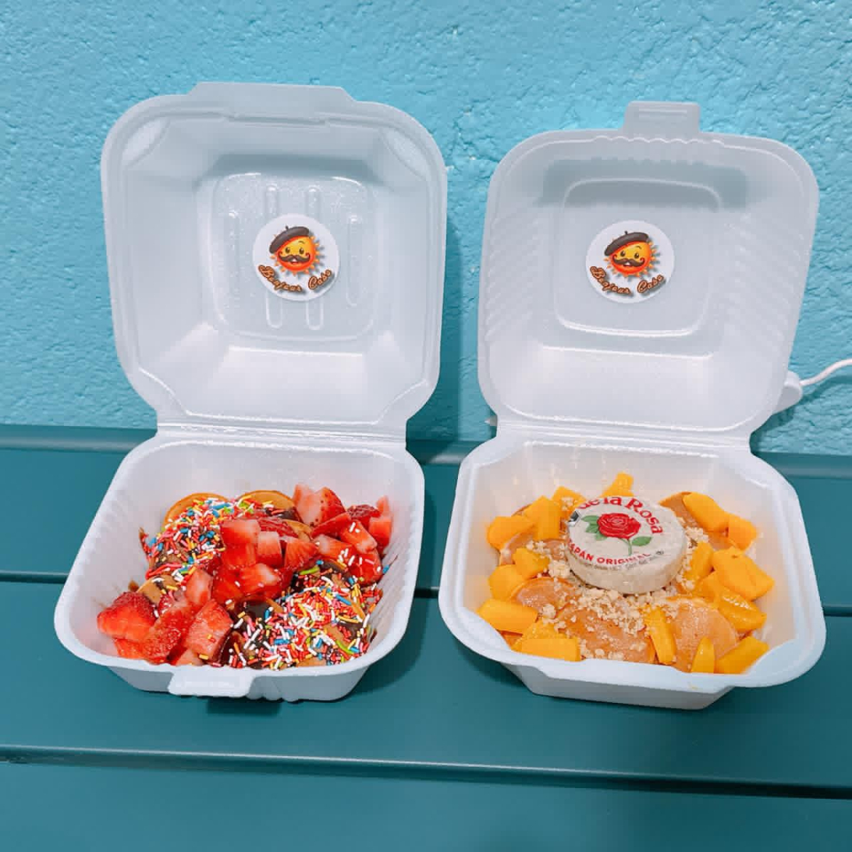 Fresas congeladas rebanadas acompañadas con crema dulce.