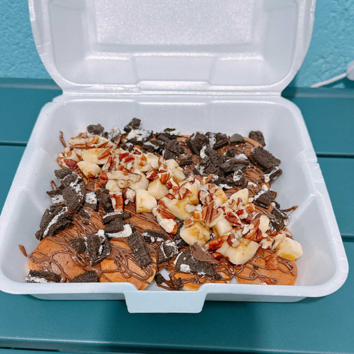 12 piezas de mini hotcakes, 2 toppings a escoger y 1 jarabe.