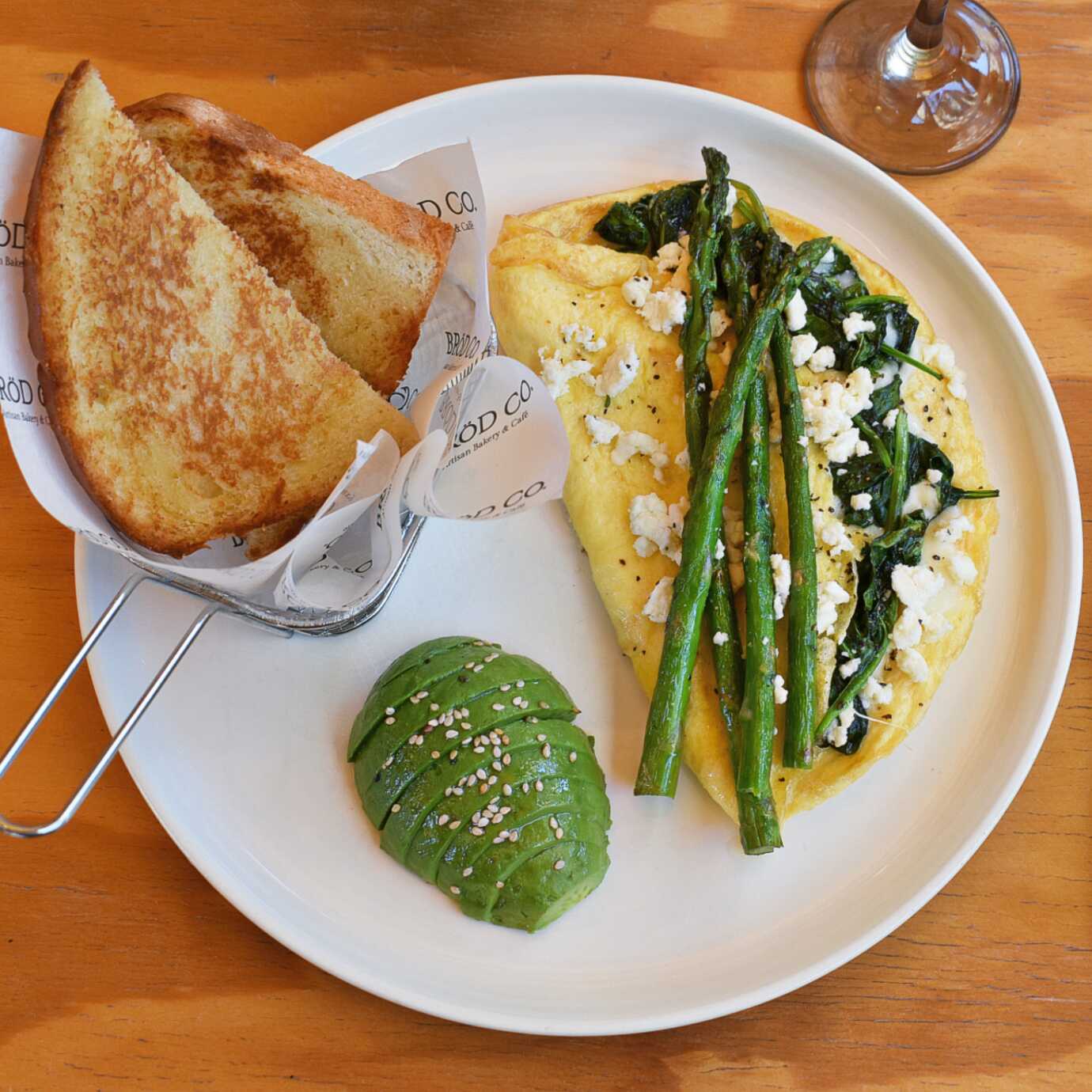 Omelette con queso mozzarella, espinacas y esparragos, acompañado con aguacate y pan brioche.