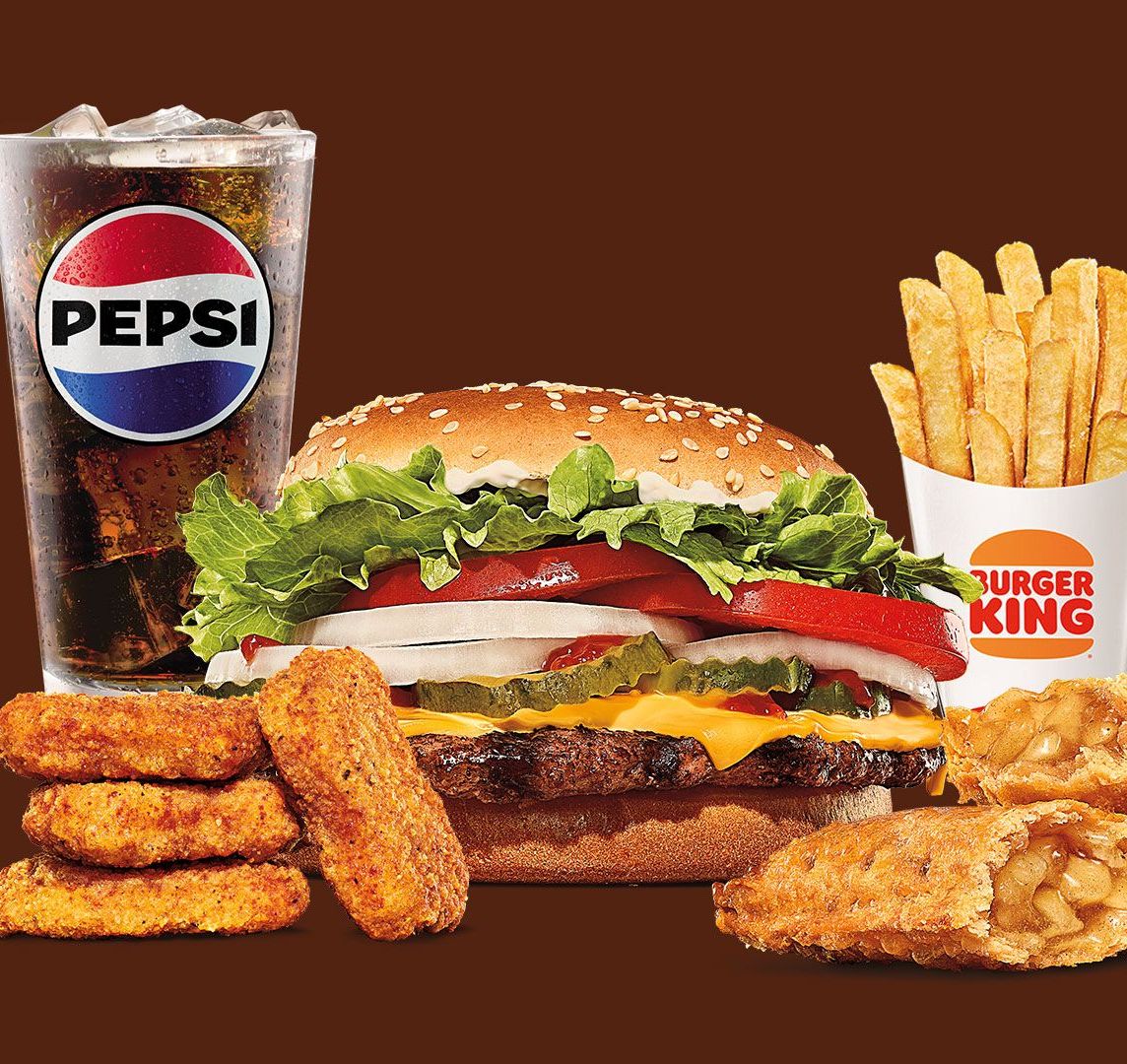 Sabor para compartir en familia: 1 Whopper® con queso + 1 King de Pollo con queso + 2 Whopper Jr con queso + 3 Papas chicas.