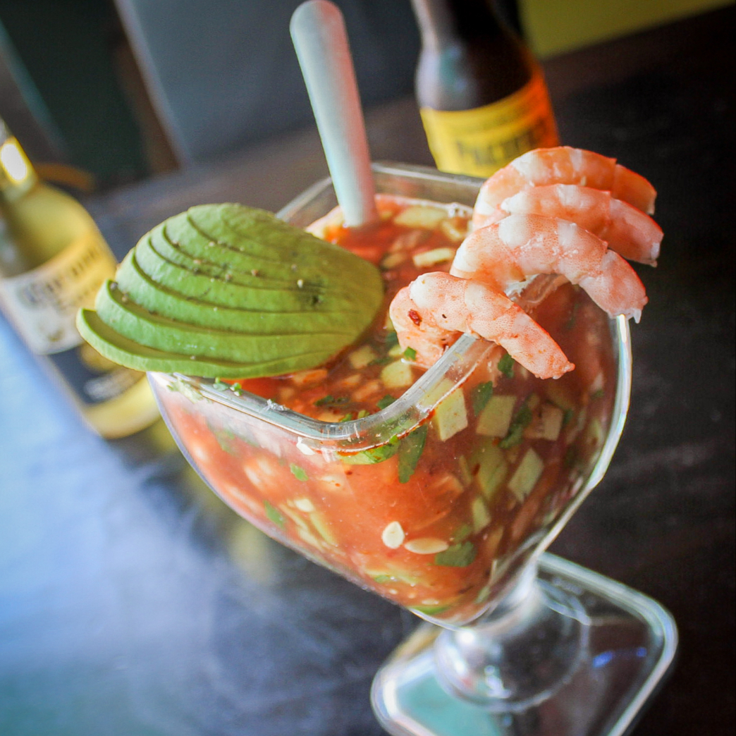 CLAMATO PREPARADO CON CERVEZA Y CEVICHE DE CAMARON